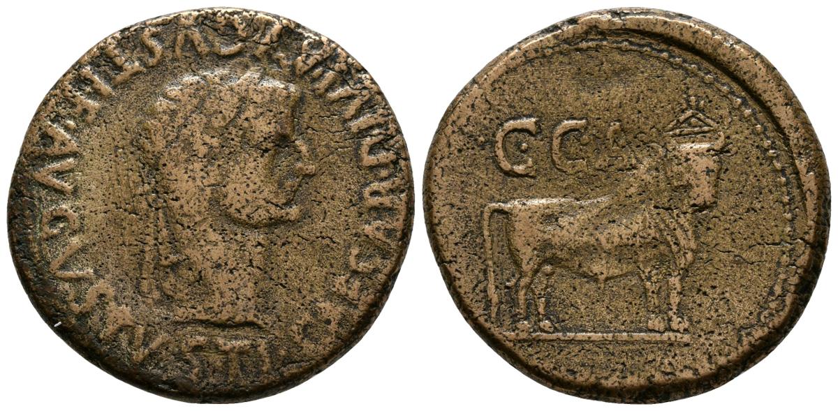 CAESARAUGUSTA. As. Epoca de Tiberio. 14-36 a.C. Zaragoza. A/ Cabeza del emperador laureada a derecha. TI. CAESAR DIVI. AVGVSTI. F. AVGVSTVS. R/ Toro mirando a derecha, encima C.C.A. FAB-367var. Ae. 12,26g. BC+/MBC-.