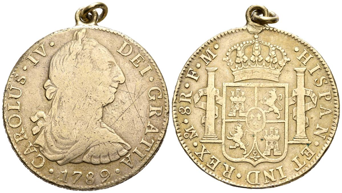 CARLOS IV. 8 Reales. 1789. México FM. Busto de Carlos III y ordinal IV. Cal-681. Ar. 27,29g. Sobredorada y con anilla. MBC+. Escasa.