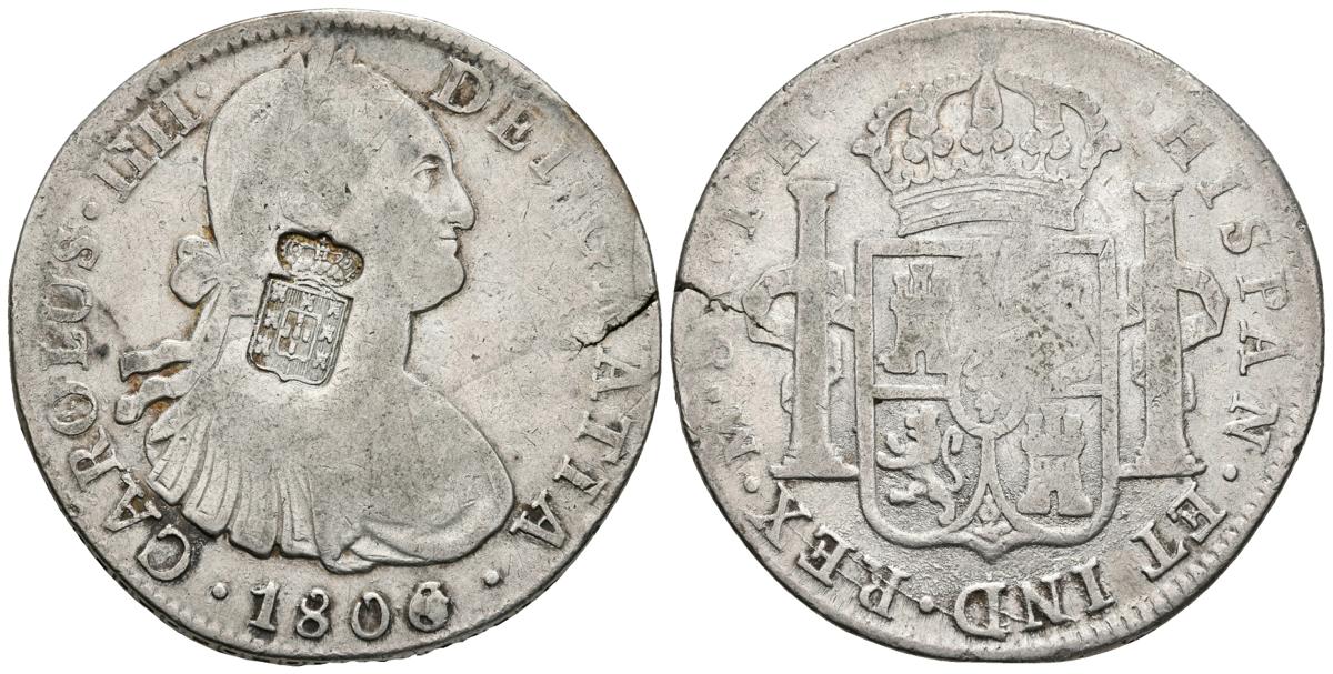 CARLOS IV. 8 Reales. 1806. México TH. Resello escudo de Portugal (De Mey 1040). Cal-705. Ar. 26,44g. BC+. Rara.