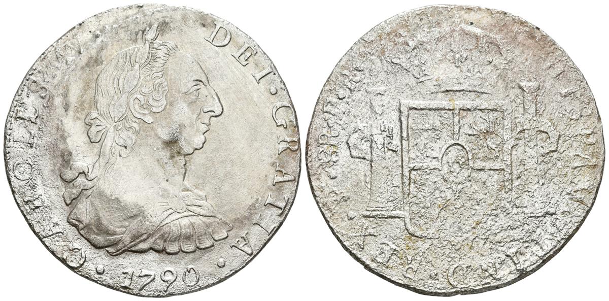 CARLOS III. 8 Reales. 1790. Potosí PR. Busto de Carlos III y ordinal IV. Cal-711. Ar. 24,97g. Oxidaciones marinas. MBC-/BC.