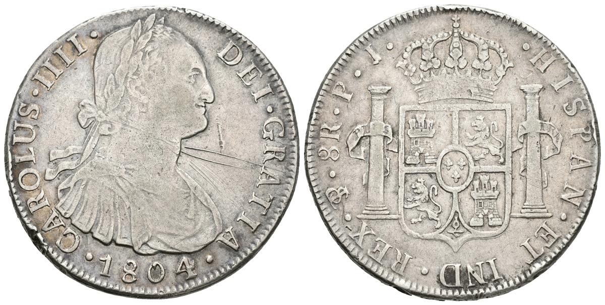 CARLOS IV. 8 Reales. 1804. Potosí PJ. Cal-727. Ar. 26,75g. Rayas en anverso y golpecitos en el canto. MBC+/MBC.