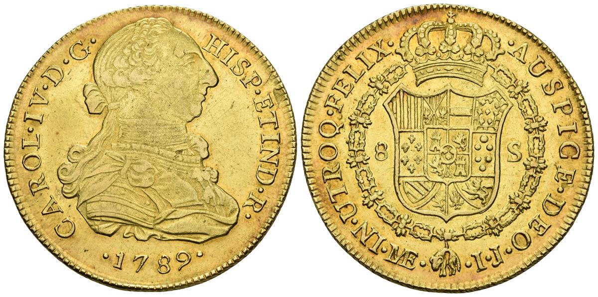 CARLOS IV. 8 Escudos. 1789. Lima IJ. Busto de Carlos III y ordinal IV. Cal. 6; Cal.Onza 978. Au. 27,05g. Conserva parte del brillo original. MBC+/EBC-.