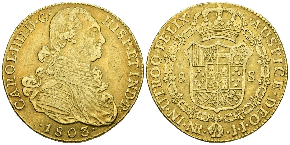 CARLOS IV. 8 Escudos. 1803. Santa Fe de Nuevo Reino JJ. Cal-137; Cal. Onza. 1140. Au. 27,05g. MBC.