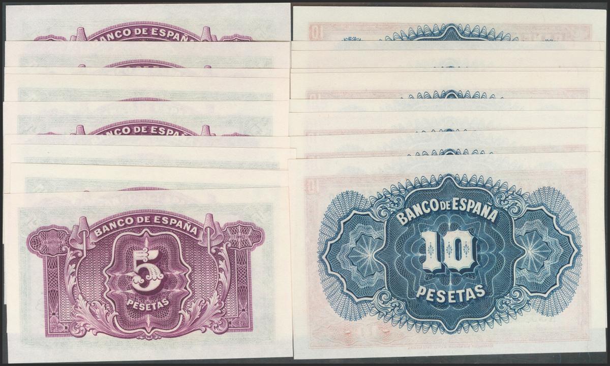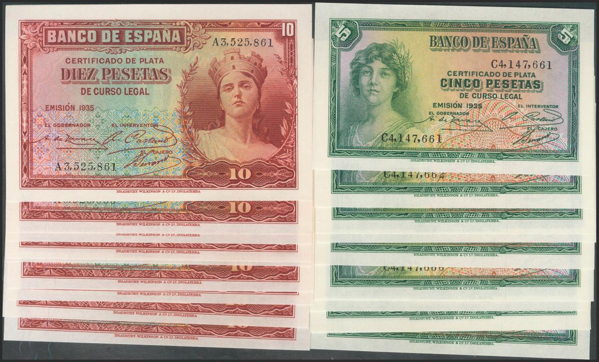 Conjunto de 10 series completas de los billetes correlativos de 5 Pesetas y 10 Pesetas emitidos en 1935, con las series C y A, respectivamente. (Edifil 2017: 363/64a). SC.