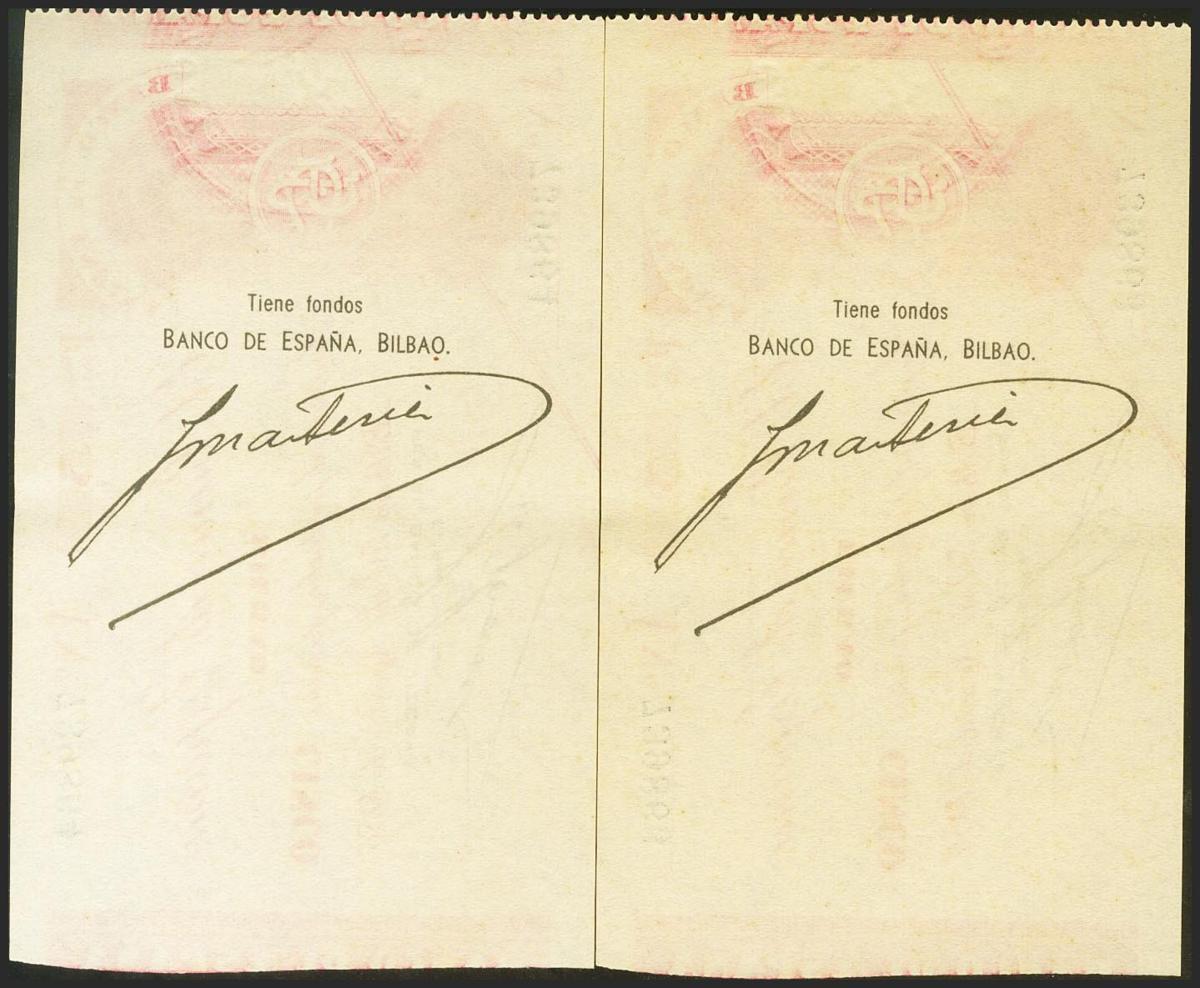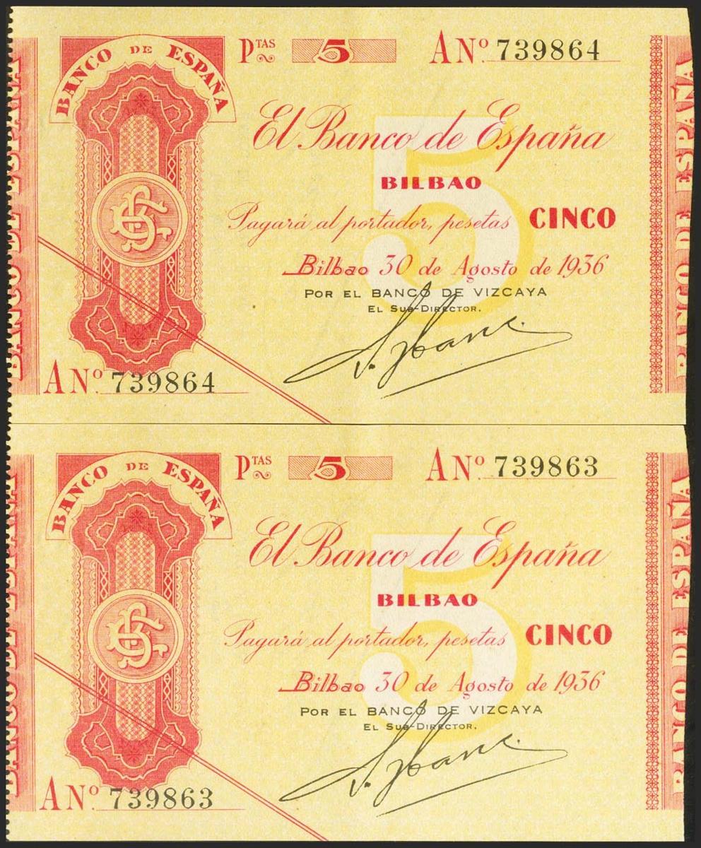 5 Pesetas. 30 de Agosto de 1936. Pareja correlativa. Sucursal de Bilbao, antefirma del Banco de Vizcaya. Serie A. (Edifil 2017: 368Aa). EBC+.