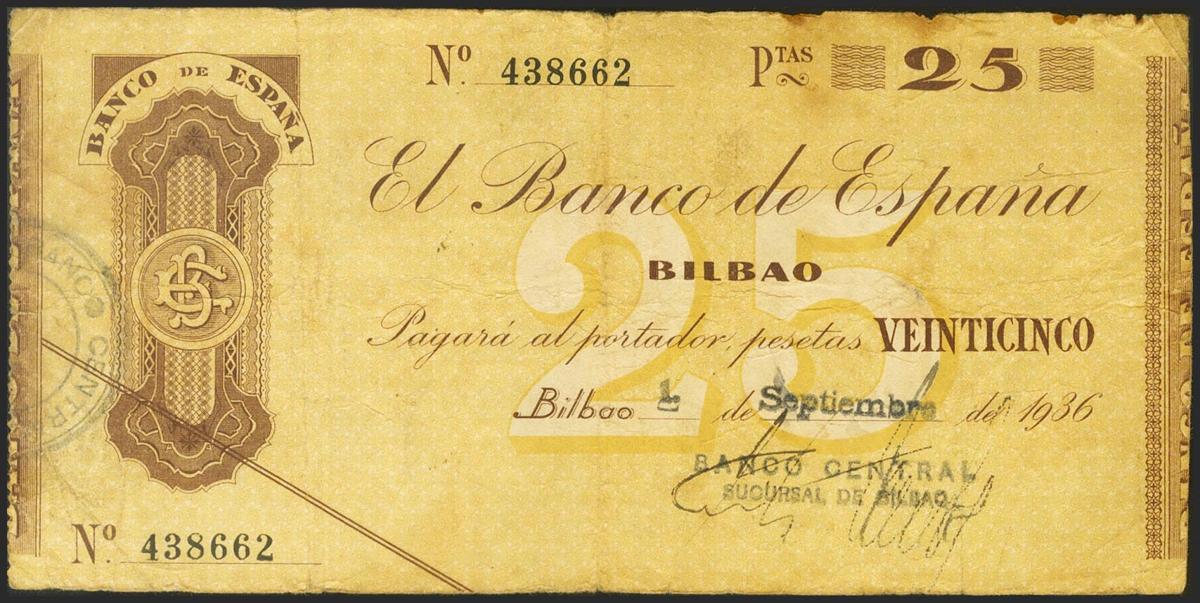 25 Pesetas. 1936. Sin serie. Sucursal de Bilbao y antefirma Banco Central. (Edifil 2021: 369c). MBC.