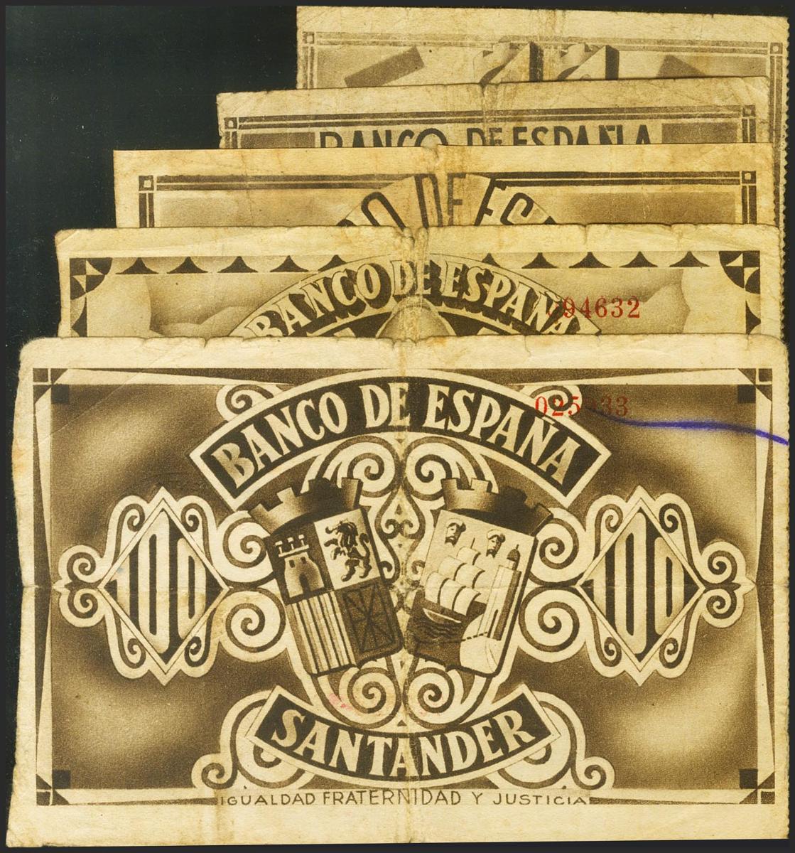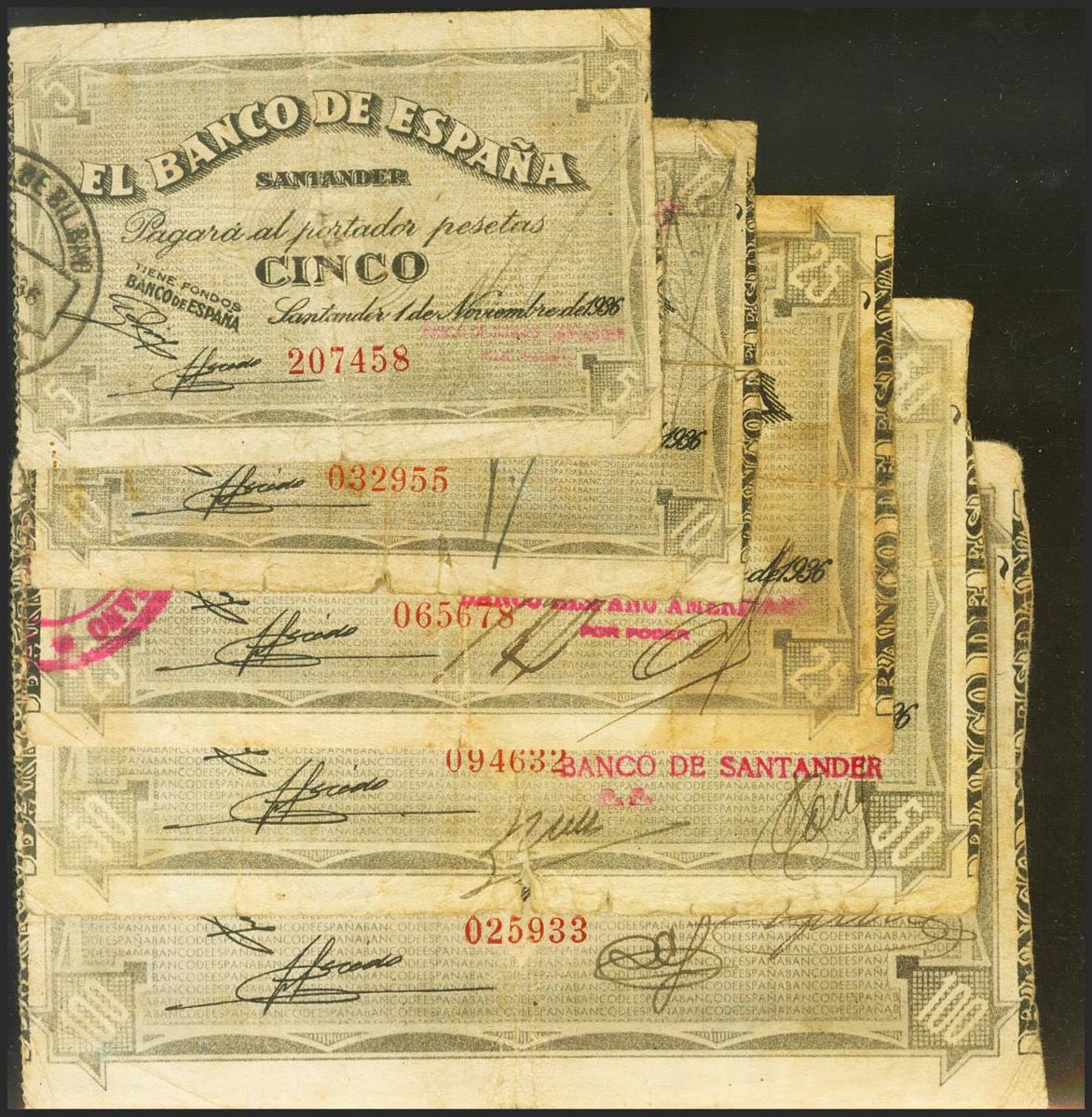 Serie de 5 billetes del Banco de España de la sucursal de Santander correspondientes a los valores de 5 Pesetas (antefirma ilegible), 10 Pesetas (antefirma del Banco de Santander), 25 Pesetas (antefirma del Banco Hispano Americano), 50 Pesetas (antefirma del Banco de Santander) y 100 Pesetas (antefirma Monte de Piedad), emitidos el 4 de Noviembre de 1936. (Edifil 2021: 375, 376g, 377c, 378g, 379h). Inusual conjunto. BC/BC+.