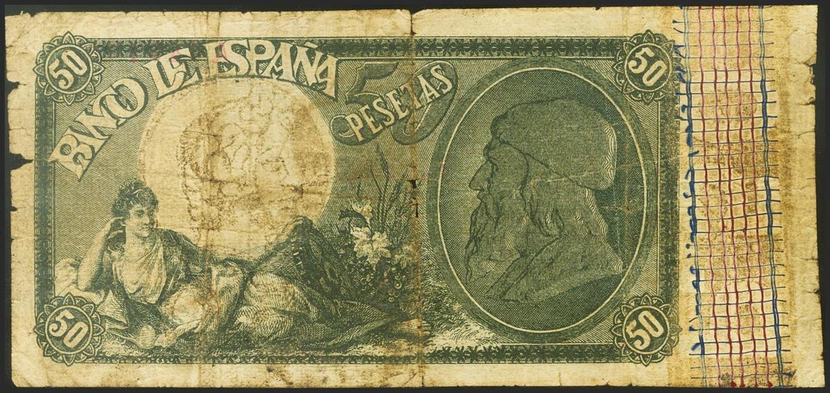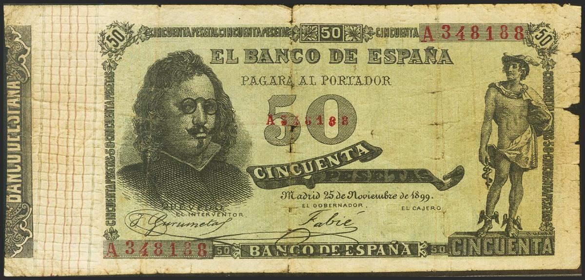 50 Pesetas. 25 de Noviembre de 1899. FALSO DE EPOCA. Serie A. (Edifil 2021: 307F). Muy raro. MBC-.
