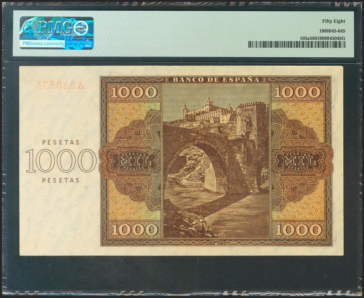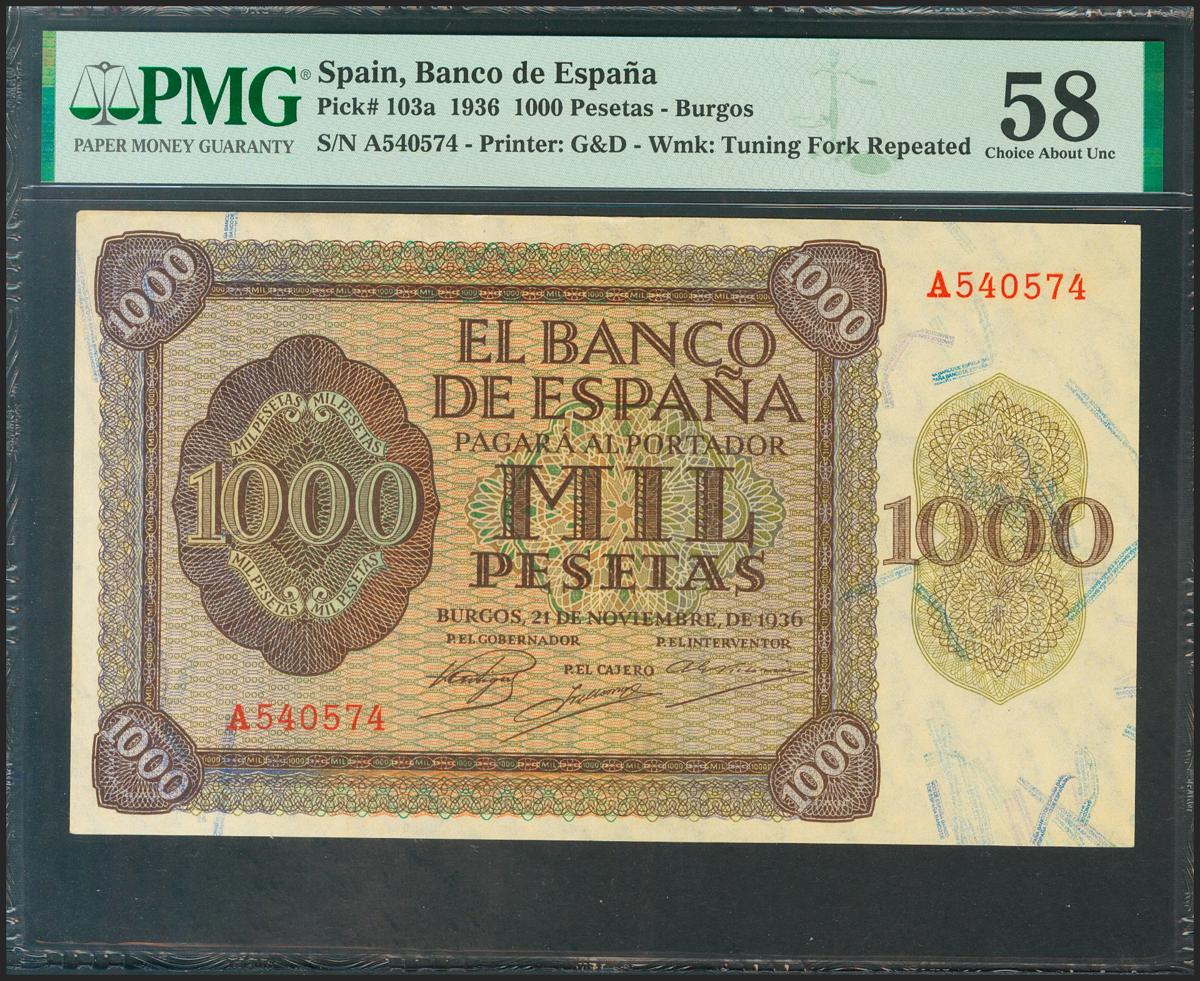 1000 Pesetas. 21 de Noviembre de 1936. Serie A. (Edifil 2021: 423, Pick: 103a). Rarísimo en esta calidad. EBC++. Encapsulado PMG58.