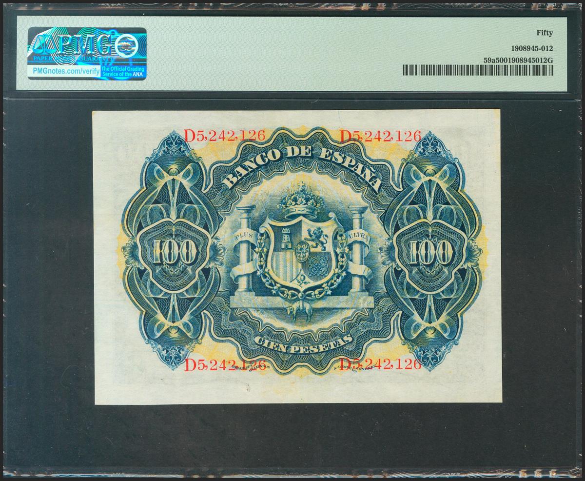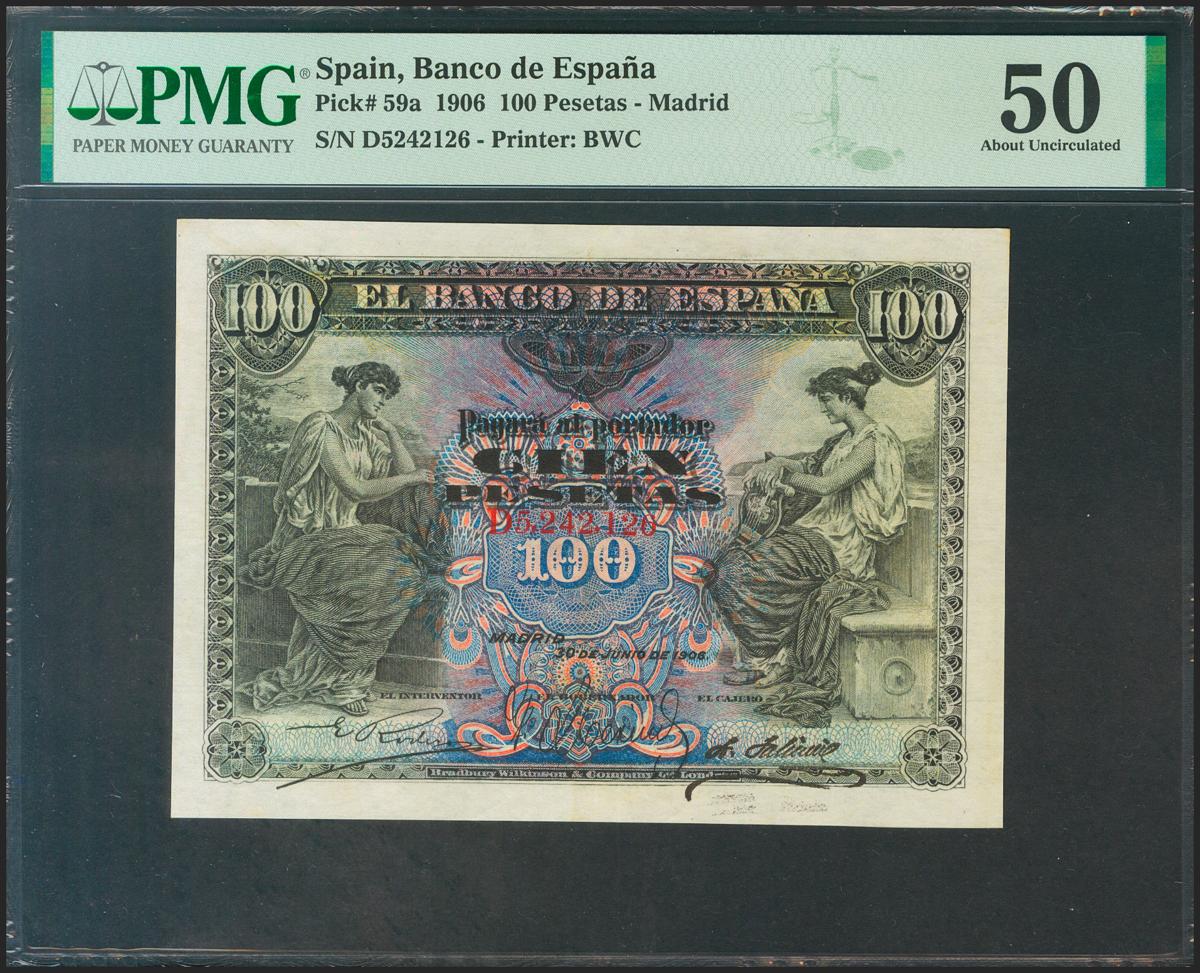 100 Pesetas. 30 de Junio de 1906. Serie D, última serie emitida. (Edifil 2021: 313a, Pick: 59a). Inusual en esta calidad. EBC+. Encapsulado PMG50.