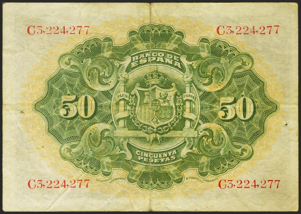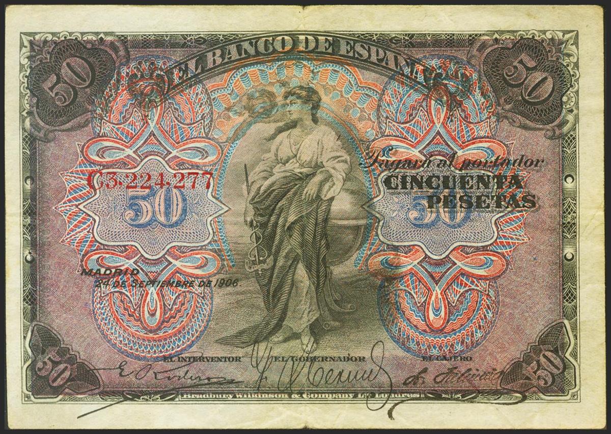 50 Pesetas. 24 de Septiembre de 1906. Serie C, última serie emitida. (Edifil 2021: 315a). MBC-.