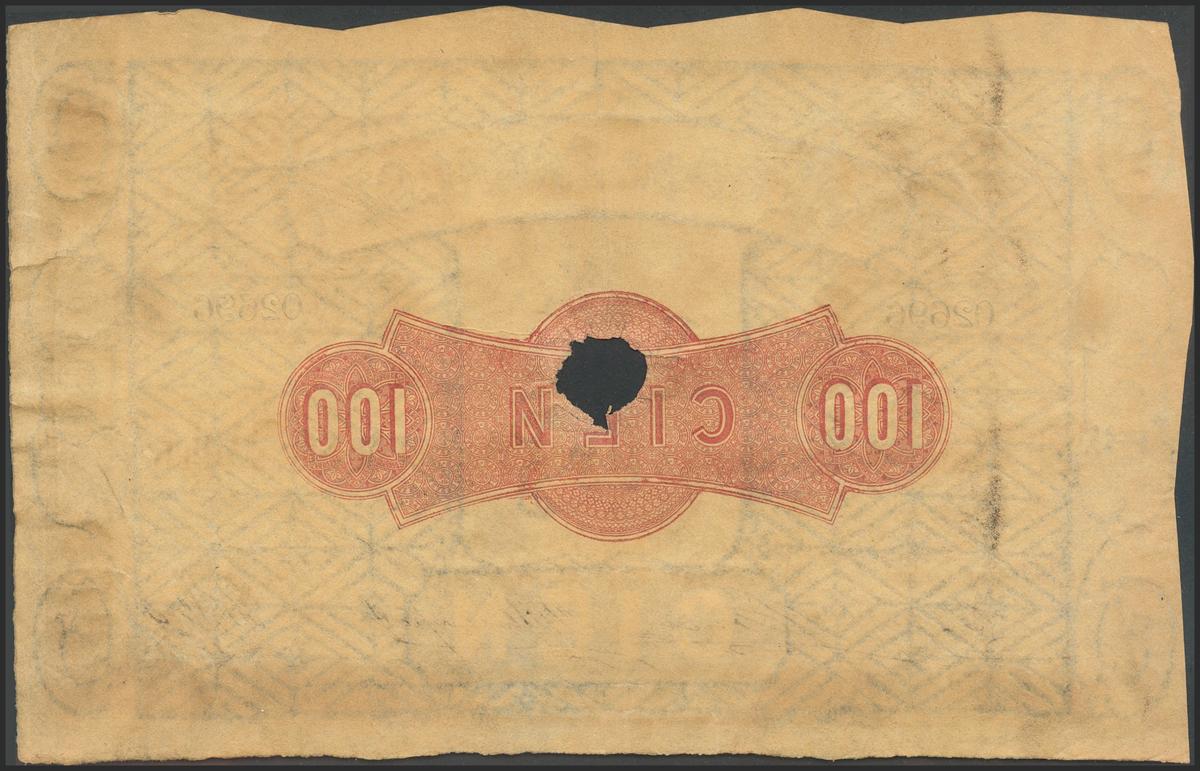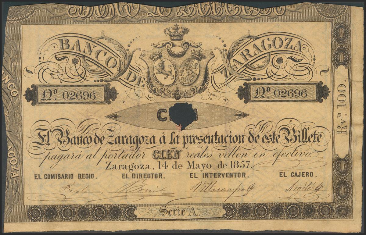 100 Reales. 14 de Mayo de 1857. Banco de Zaragoza. Serie A. Con taladro y sin firmas. (Edifil 2021: 127A). MBC+.