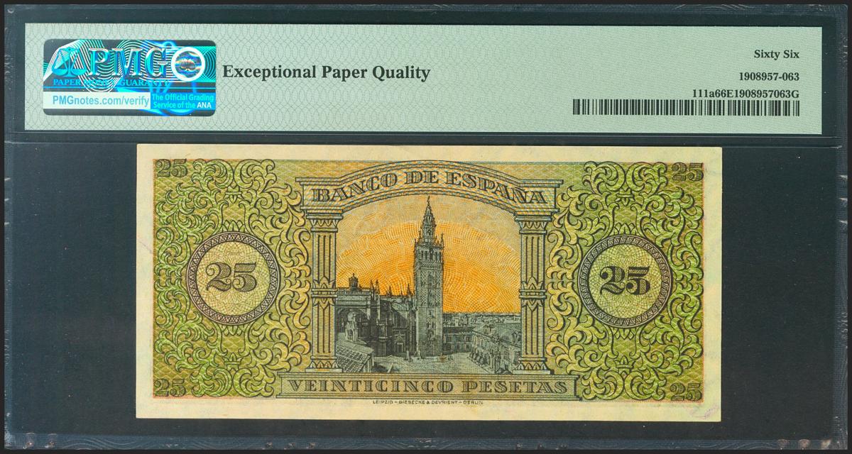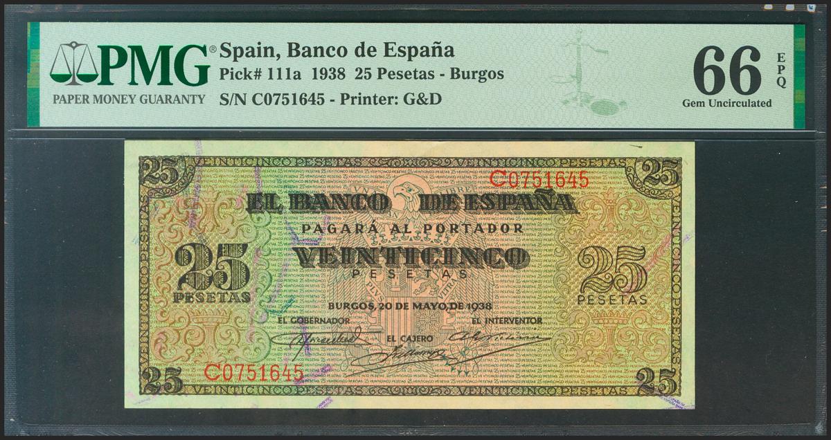 25 Pesetas. 20 de Mayo de 1938. Serie C. (Edifil 2021: 430a, Pick: 111a). Inusual en esta calidad, apresto original. SC. Encapsulado PMG66EPQ.