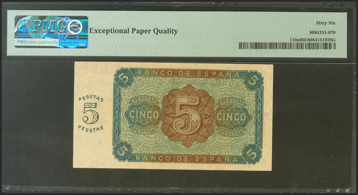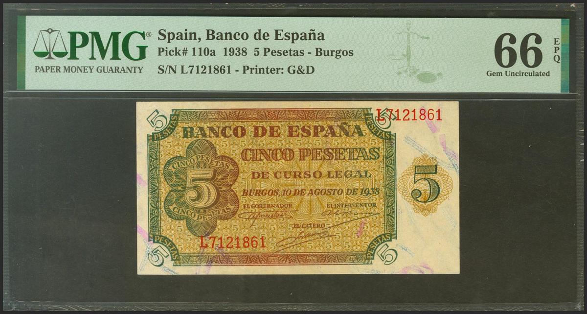 5 Pesetas. 10 de Agosto de 1938. Serie L. (Edifil 2021: 435a, Pick: 110a). Inusual en esta excepcional calidad y apresto original. SC. Encapsulado PMG66EPQ.