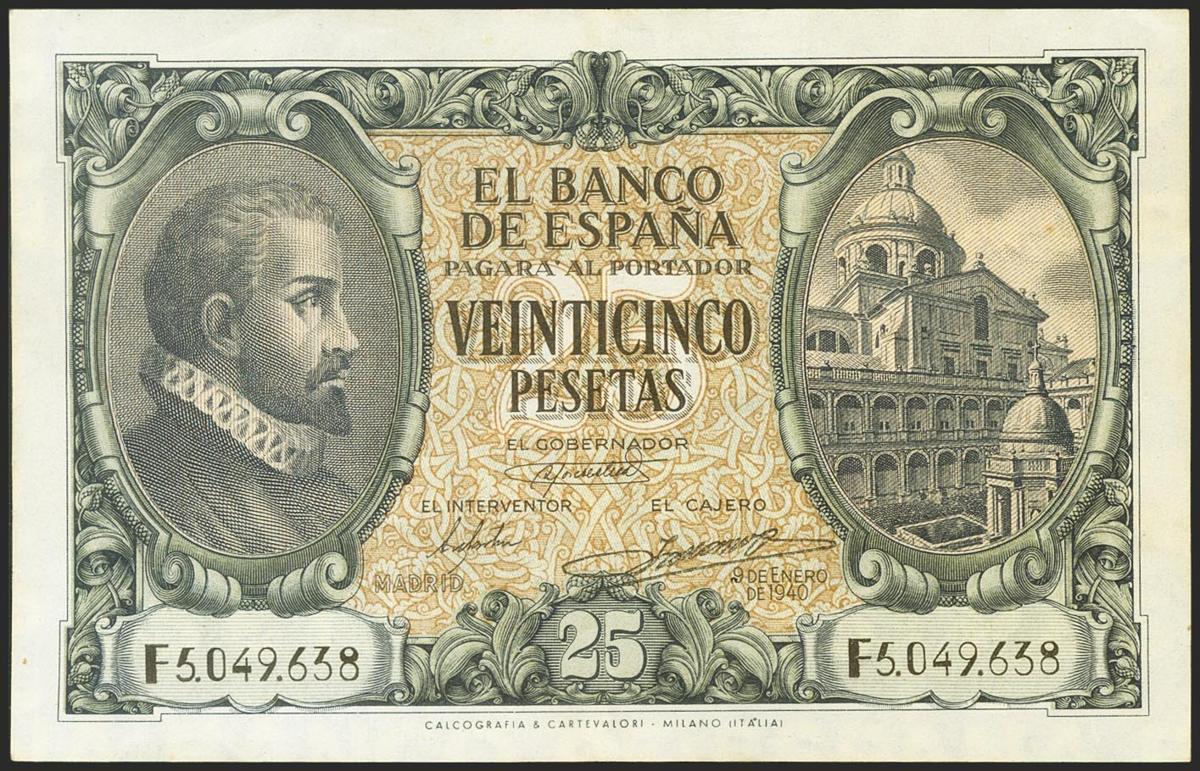 25 Pesetas. 9 de Enero de 1940. Serie F, última serie emitida. (Edifil 2021: 436a). Conserva gran parte del apresto original. EBC.
