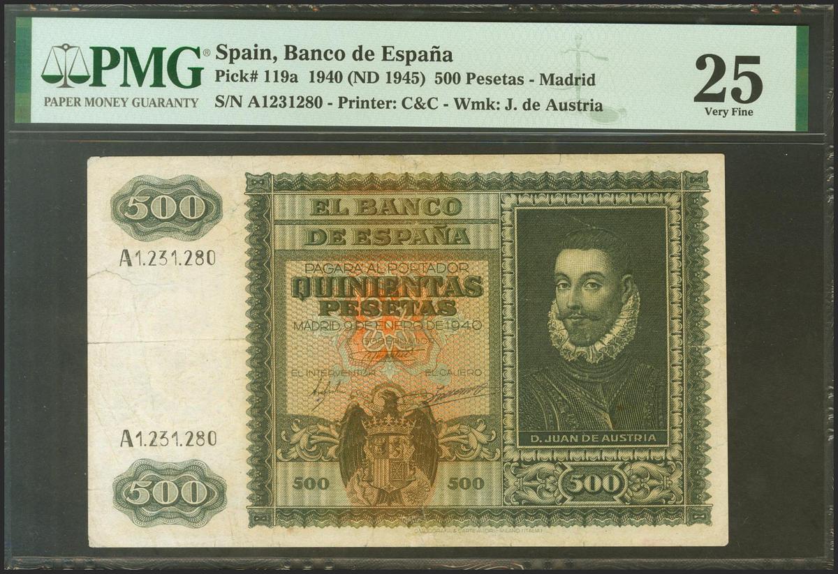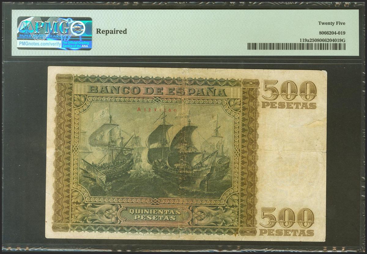 500 Pesetas. 9 de Enero de 1940. Serie A. (Edifil 2021: 439). MBC-. Encapsulado PMG25.