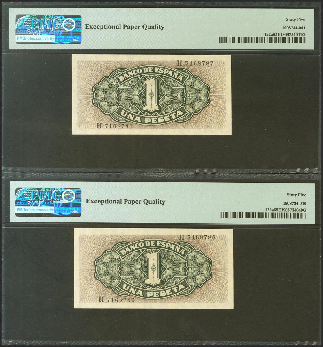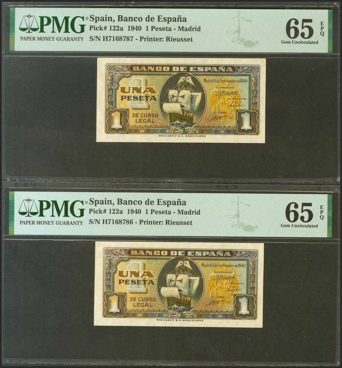 1 Peseta. 4 de Septiembre de 1940. Pareja correlativa. Serie H. (Edifil 2021: 442a). Apresto original. SC. Encapsulados PMG65EPQ, ambos.