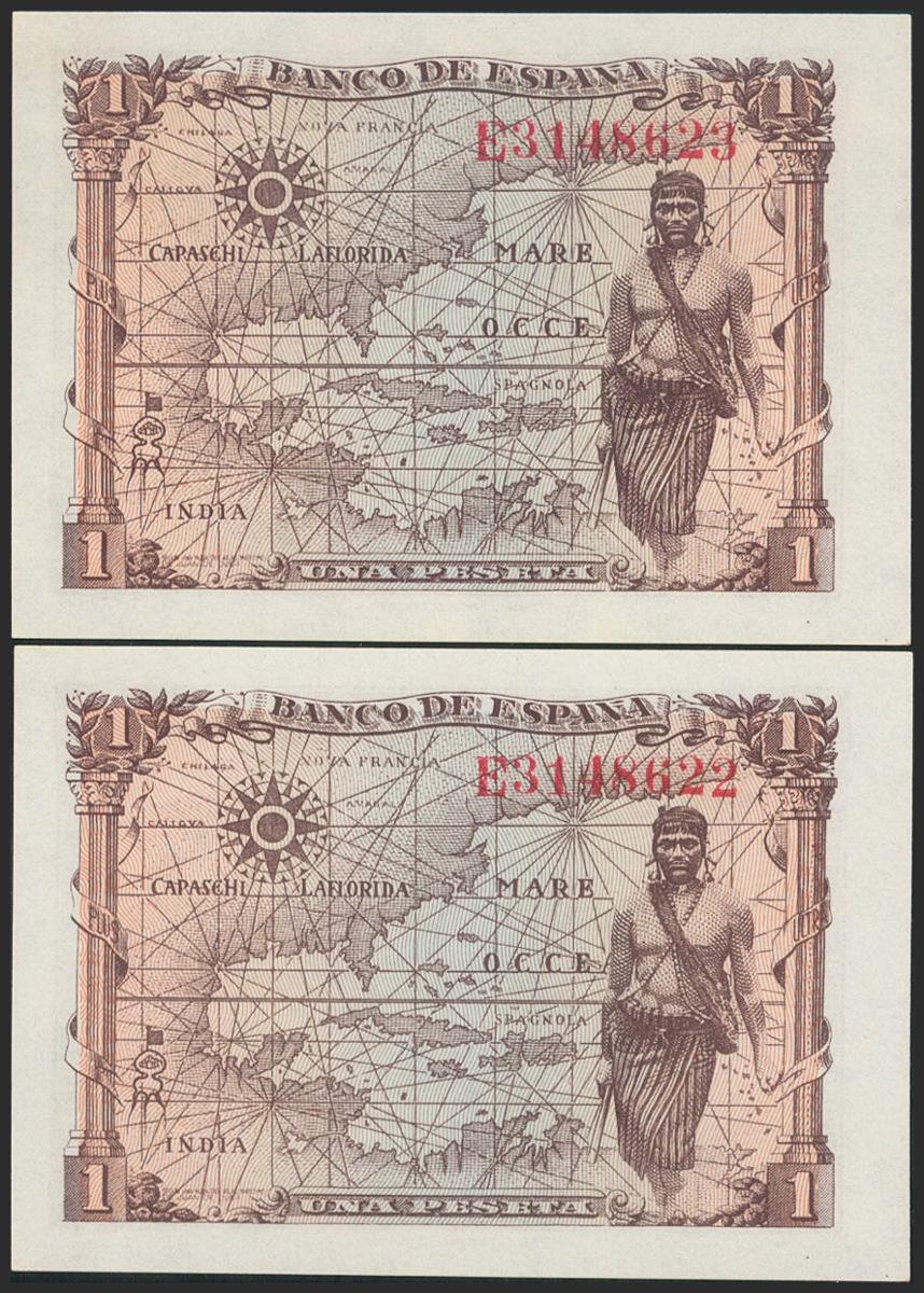 1 Peseta. 15 de Junio de 1945. Pareja correlativa. Serie E. (Edifil 2021: 448a). Apresto original. SC.