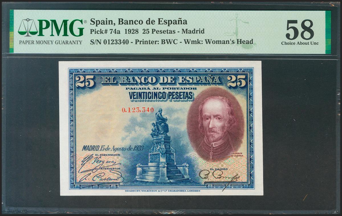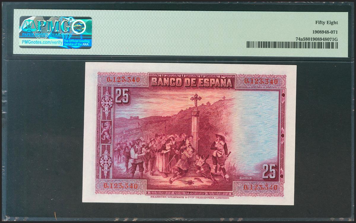 25 Pesetas. 15 de Agosto de 1928. Sin serie. (Edifil 2021: 328, Pick: 74a). Inusual, especialmente en esta calidad. EBC++. Encapsulado PMG58.