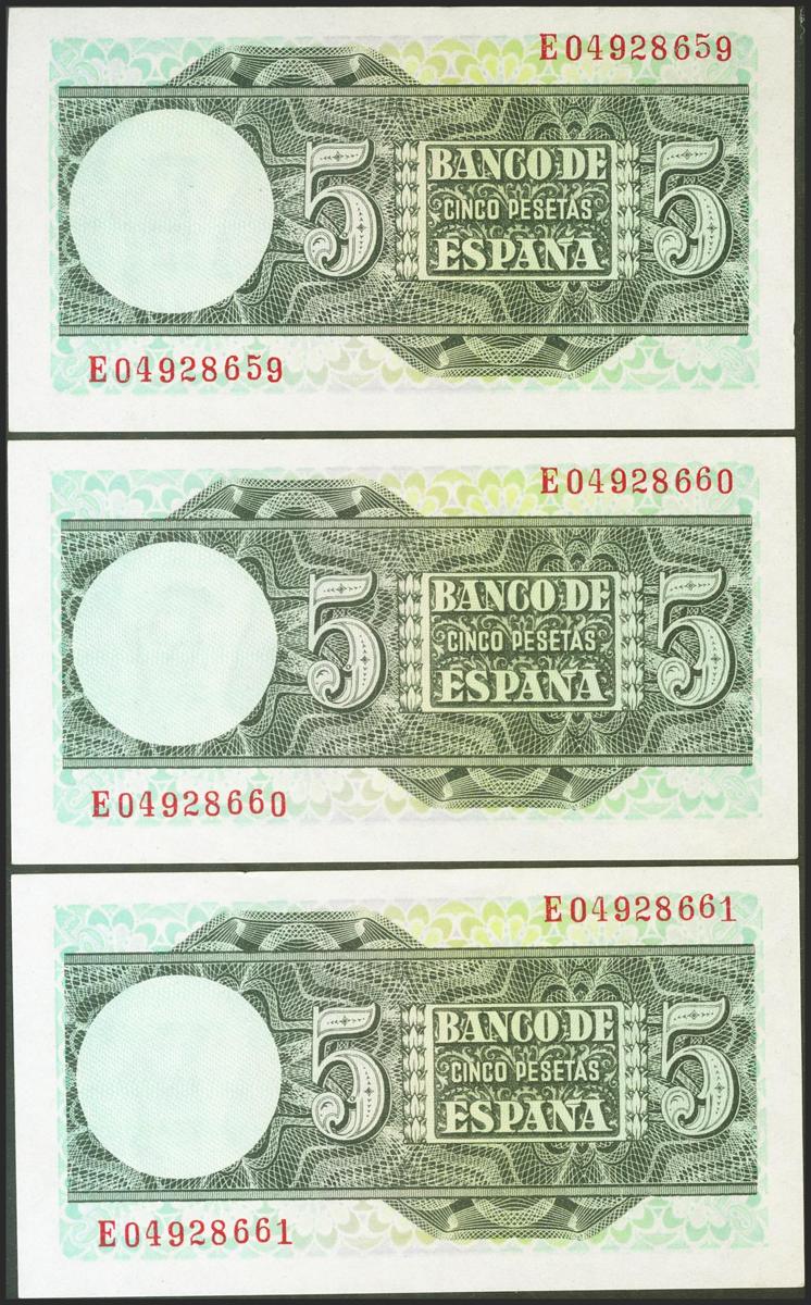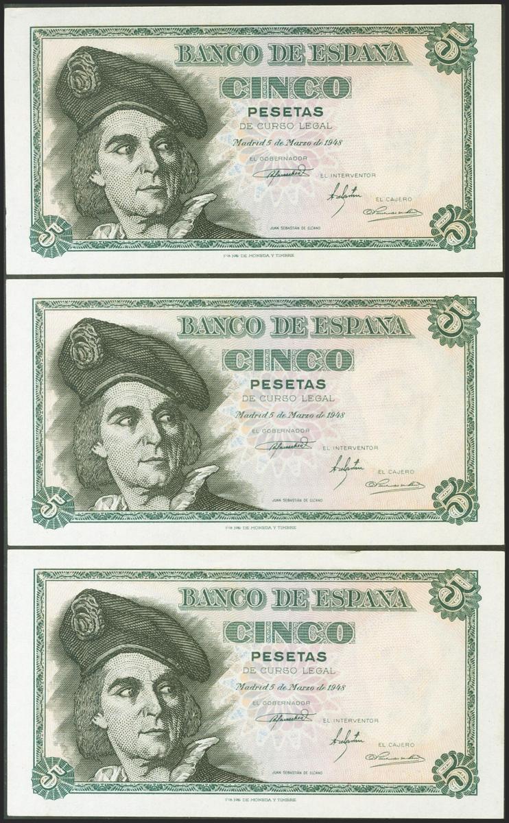 5 Pesetas. 5 de Marzo de 1948. Trío correlativo. Serie E. (Edifil 2021: 455a). Apresto original. SC/SC-.