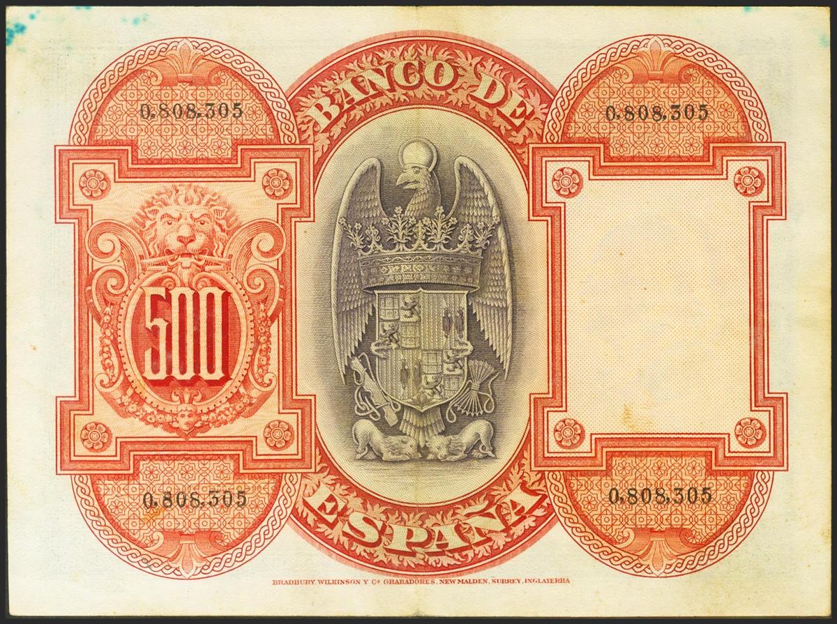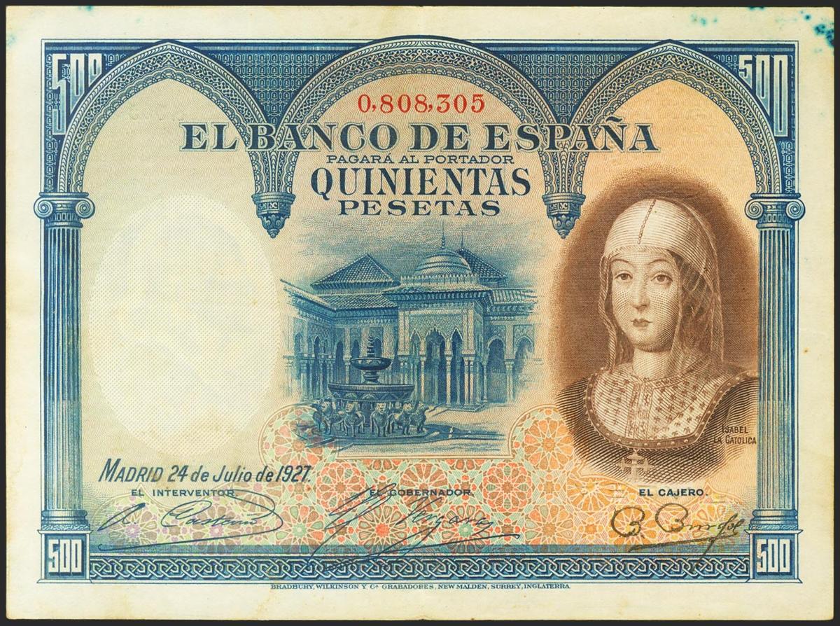 500 Pesetas. 24 de Julio de 1927. Sin serie, numeración inferior a 1602000 y con sellos en seco Gobierno Provisional de la República 14 Abril 1931 y F. Alba / Tánger ¿privado?. (Edifil 2022: 346) MBC.