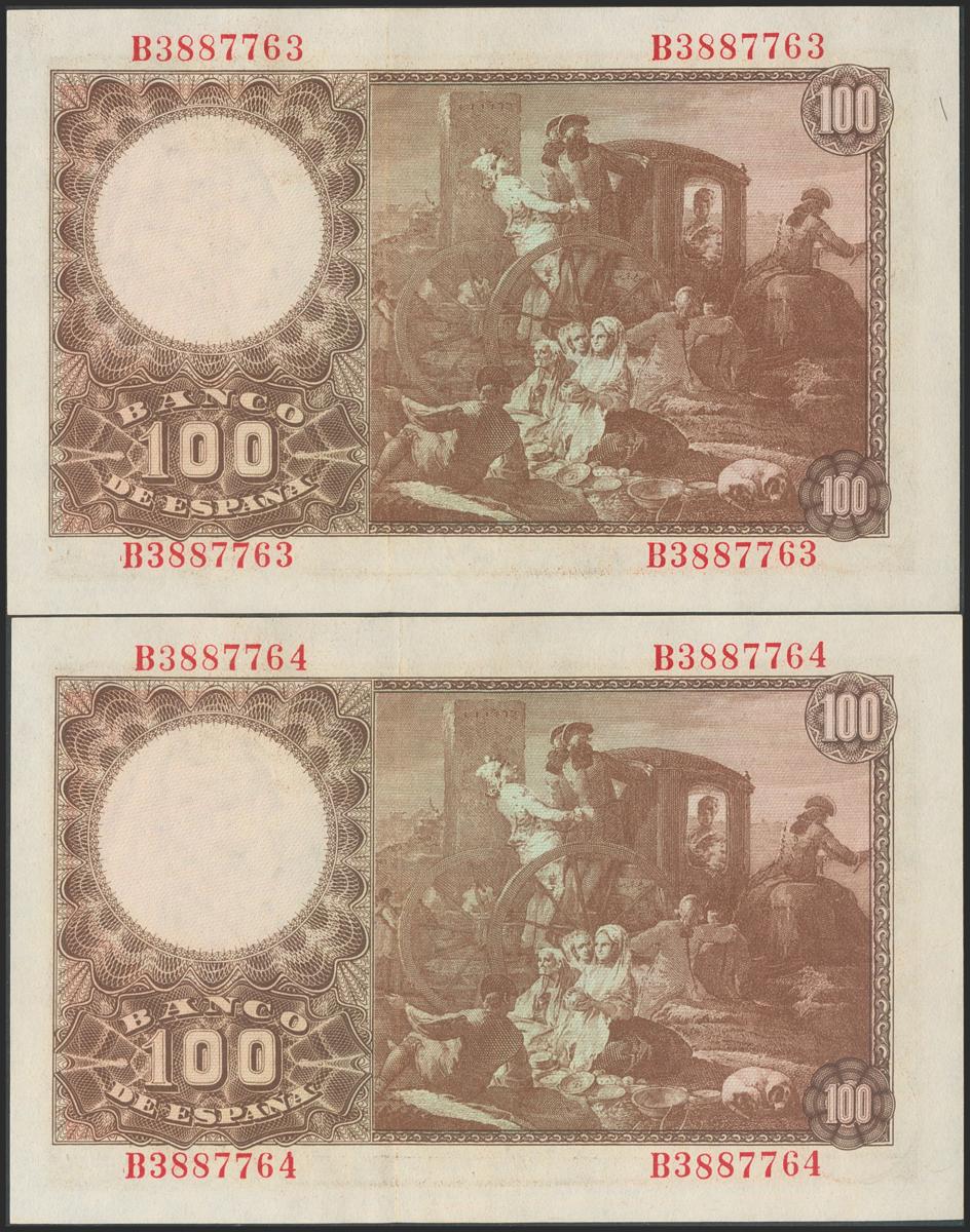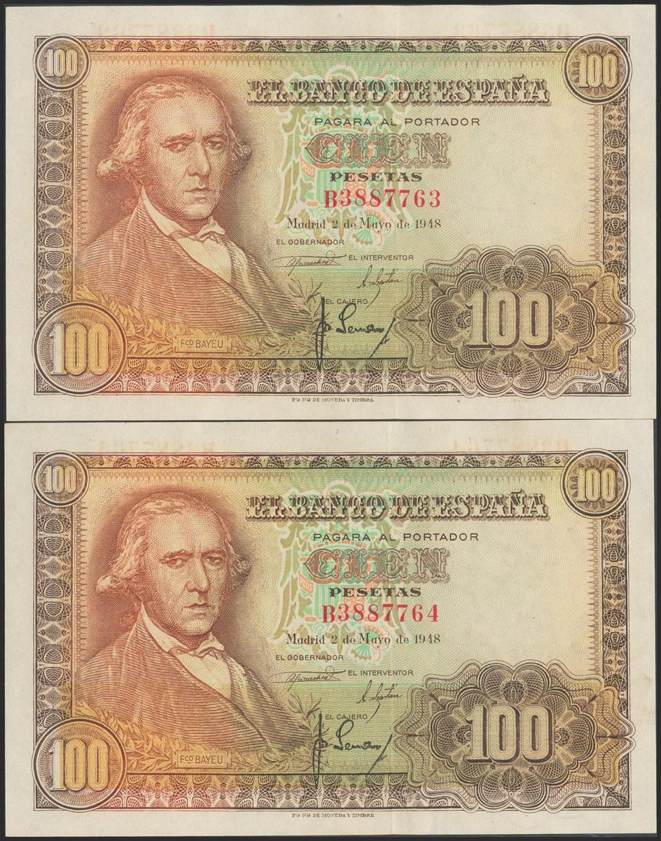 100 Pesetas. 2 de Mayo de 1948. Pareja correlativa. Serie B. (Edifil 2017: 456a). Apresto original. SC.