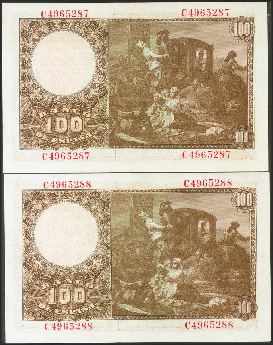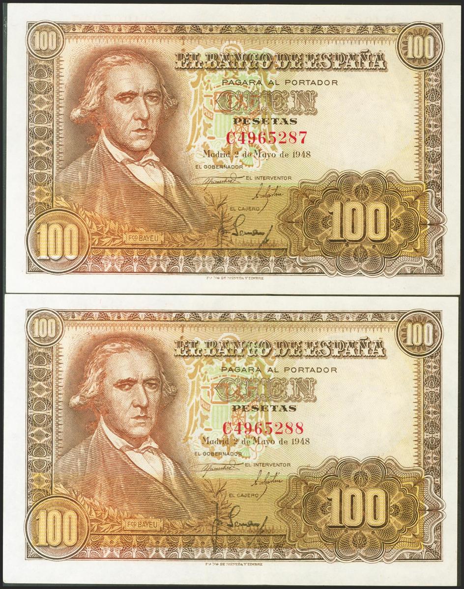 100 Pesetas. 2 de Mayo de 1948. Pareja correlativa. Serie C. (Edifil 2021: 456a). Conserva gran parte del apresto original. EBC+.