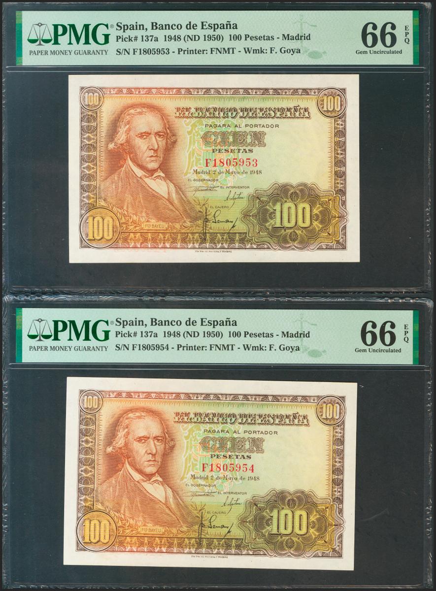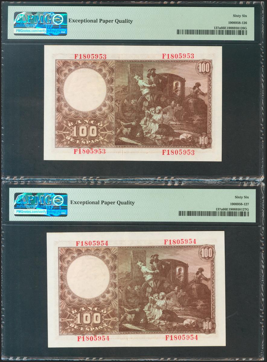 100 Pesetas. 2 de Mayo de 1948. Pareja correlativa. Serie F. (Edifil 2021: 456a, Pick: 137a). Raro en esta calidad, apresto original. SC. Encapsulado PMG66EPQ, ambos.