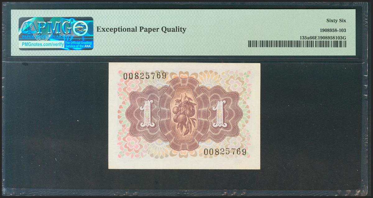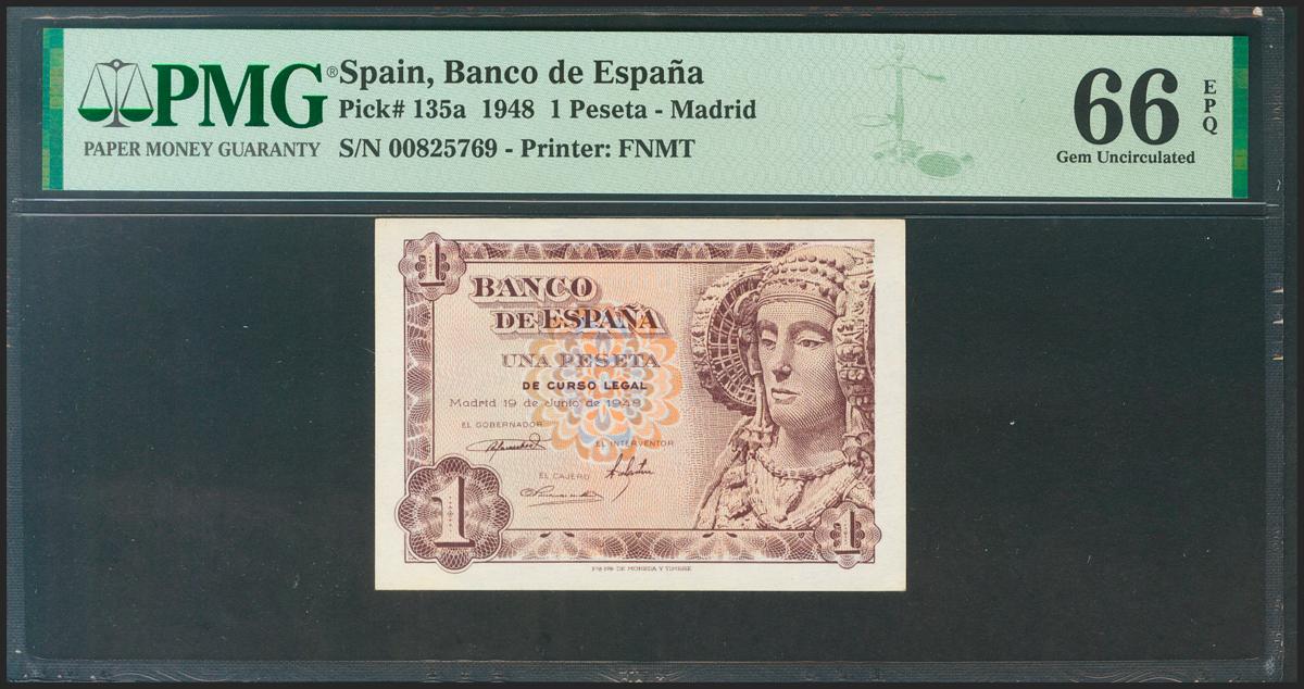 1 Pesetas. 19 de Junio de 1948. Sin serie. (Edifil 2021: 457, Pick: 135a). Raro en esta calidad, apresto original. SC. Encapsulado PMG66EPQ.