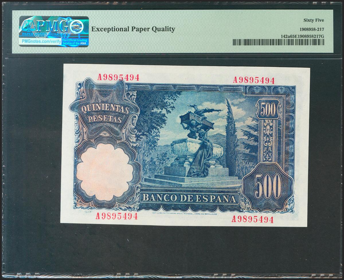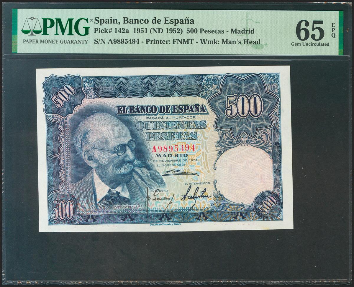 500 Pesetas. 15 de Noviembre de 1951. Serie A. (Edifil 2021: 460a, Pick: 142a). Rarísimo en esta calidad, apresto original. SC. Encapsulado PMG65EPQ.