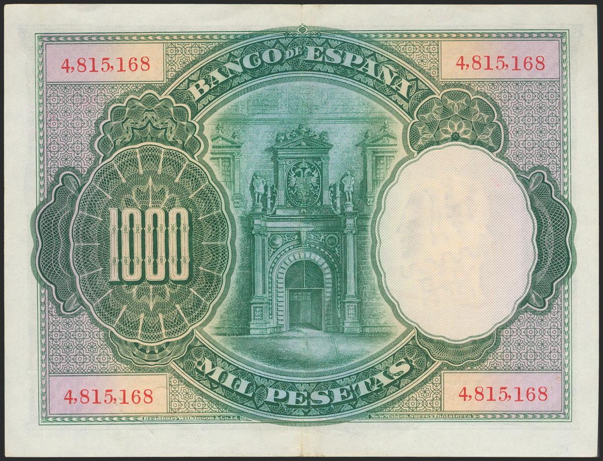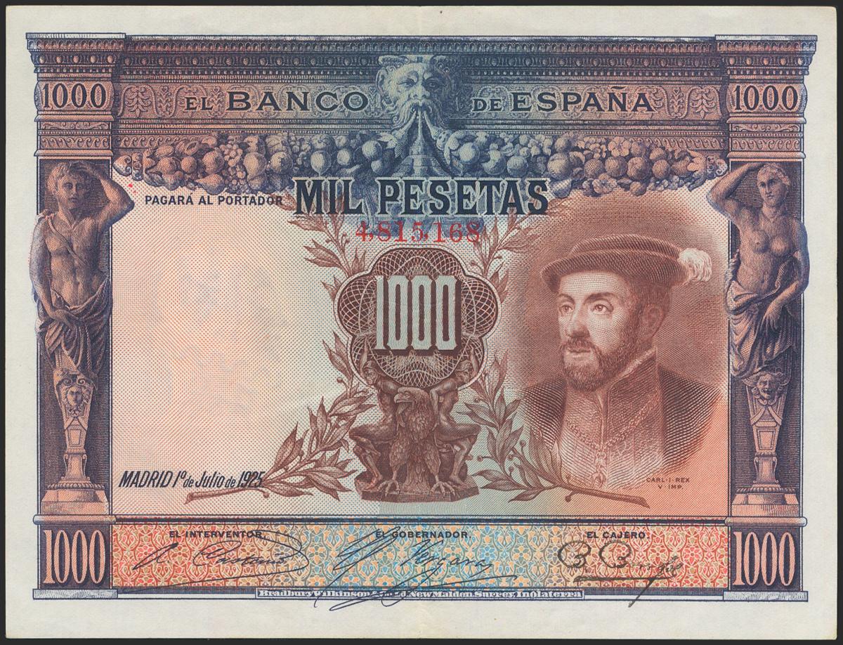 1000 Pesetas. 1 de Julio de 1925. Sin serie y numeración posterior a 3646000. (Edifil 2021: 351). Conserva parte del apresto original. EBC.
