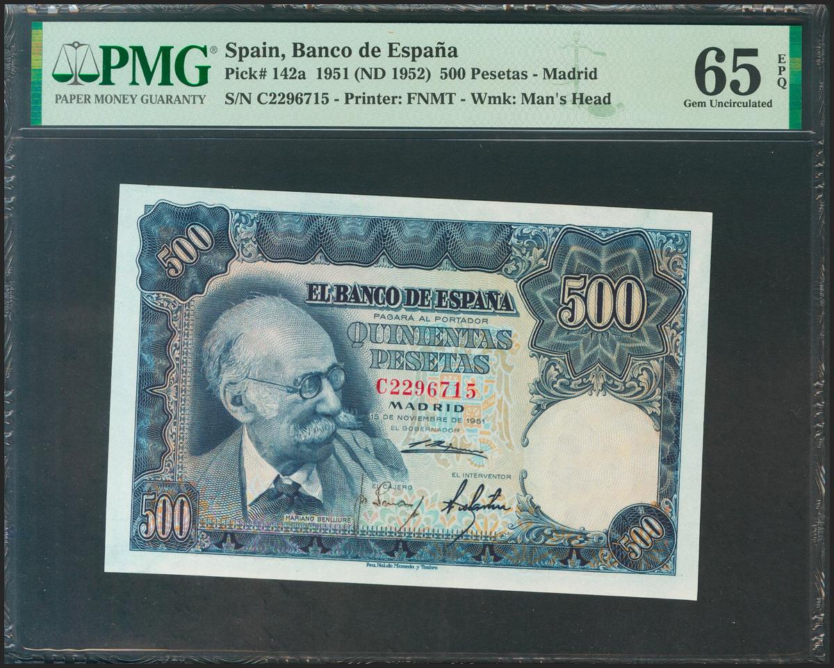 500 Pesetas. 15 de Noviembre de 1951. Serie C, última serie emitida. (Edifil 2021: 460a, Pick: 142a). Raro en esta calidad, apresto original. SC. Encapsulado PMG65EPQ.