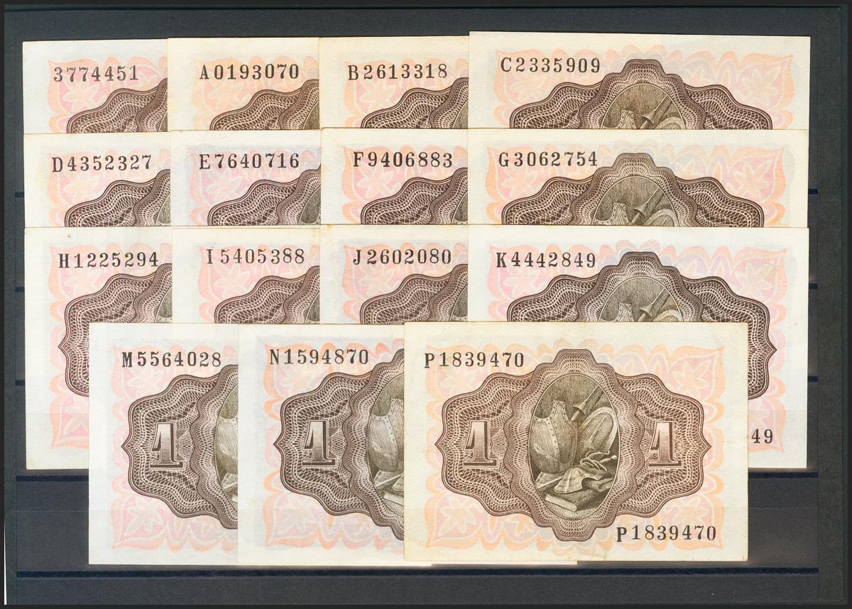 Precioso conjunto de 15 billetes de 1 Peseta emitidos el 19 de Noviembre de 1951, incluyendo todas las letras, a excepción de la L, Q, R, S y T, e incluyendo el sin serie (sin serie EBC-, A EBC-, B EBC-, C EBC, D EBC, E EBC, F EBC, G EBC, H EBC, I EBC, J EBC-, K EBC, M EBC, N EBC, P EBC-). (Edifil 2021: 461, 461a). Inusual conjunto.
