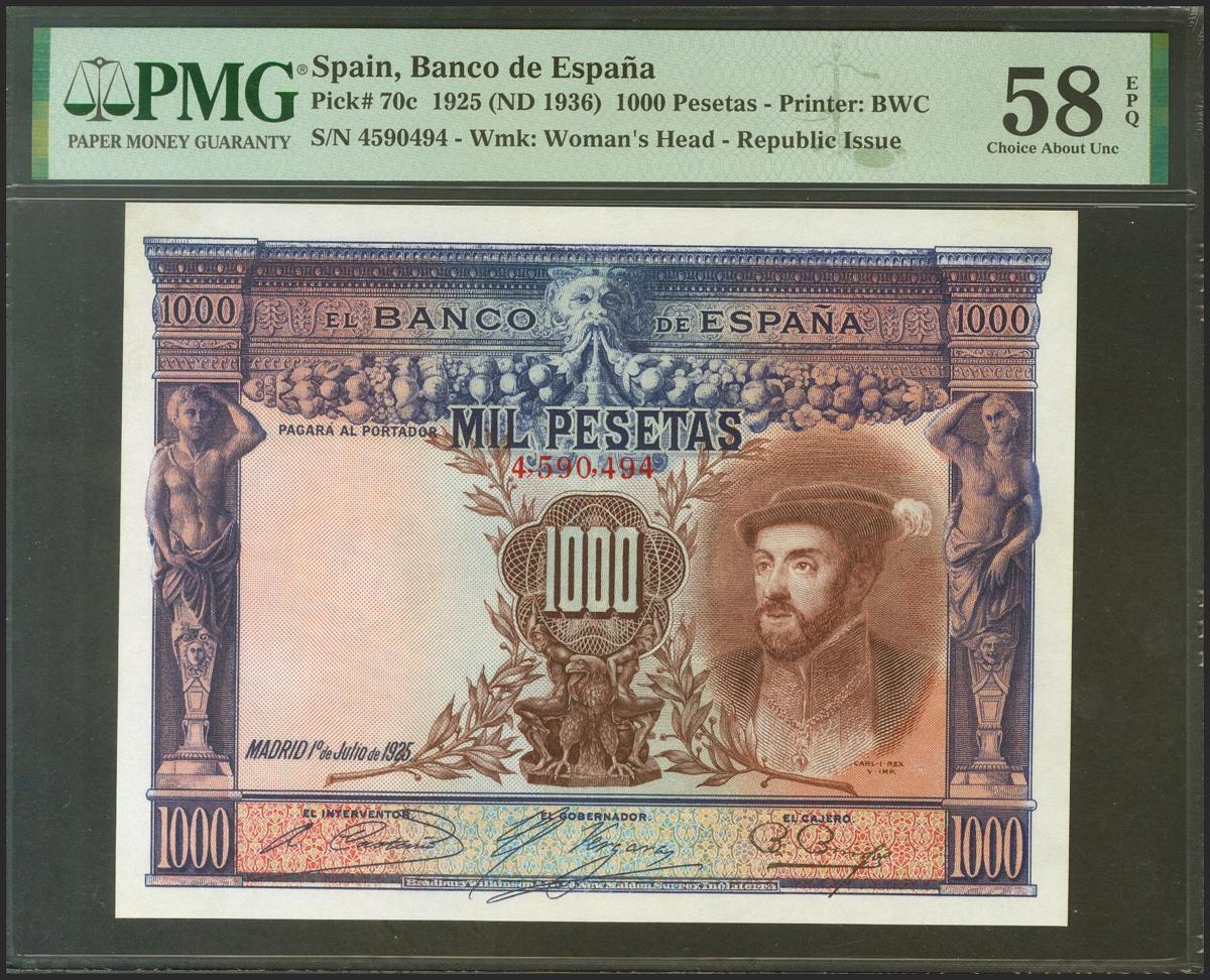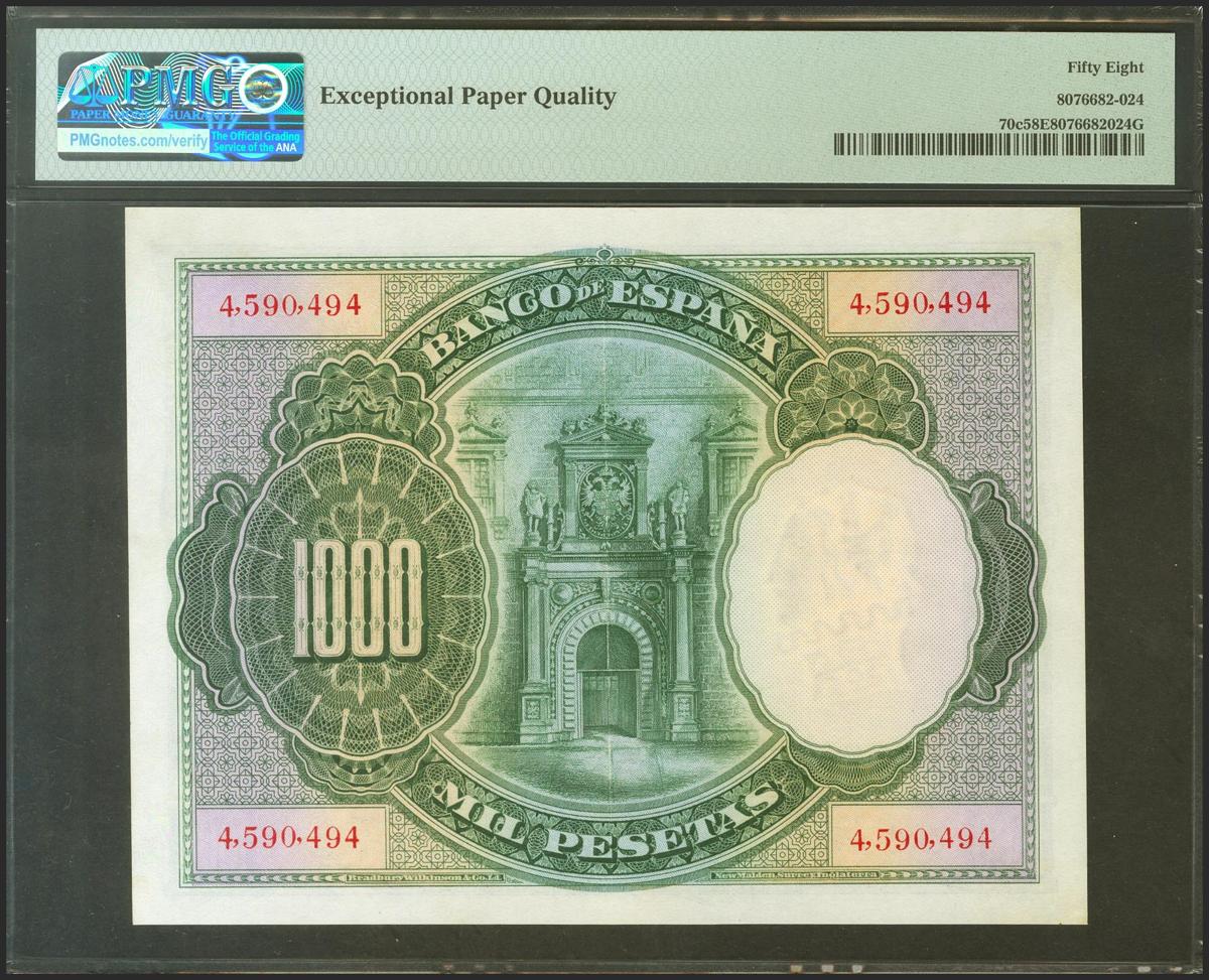 1000 Pesetas. 1 de Julio de 1925. Sin serie y numeración posterior a 3646000. (Edifil 2021: 351, Pick: 70c). Apresto original. EBC+++. Encapsulado PMG58EPQ.