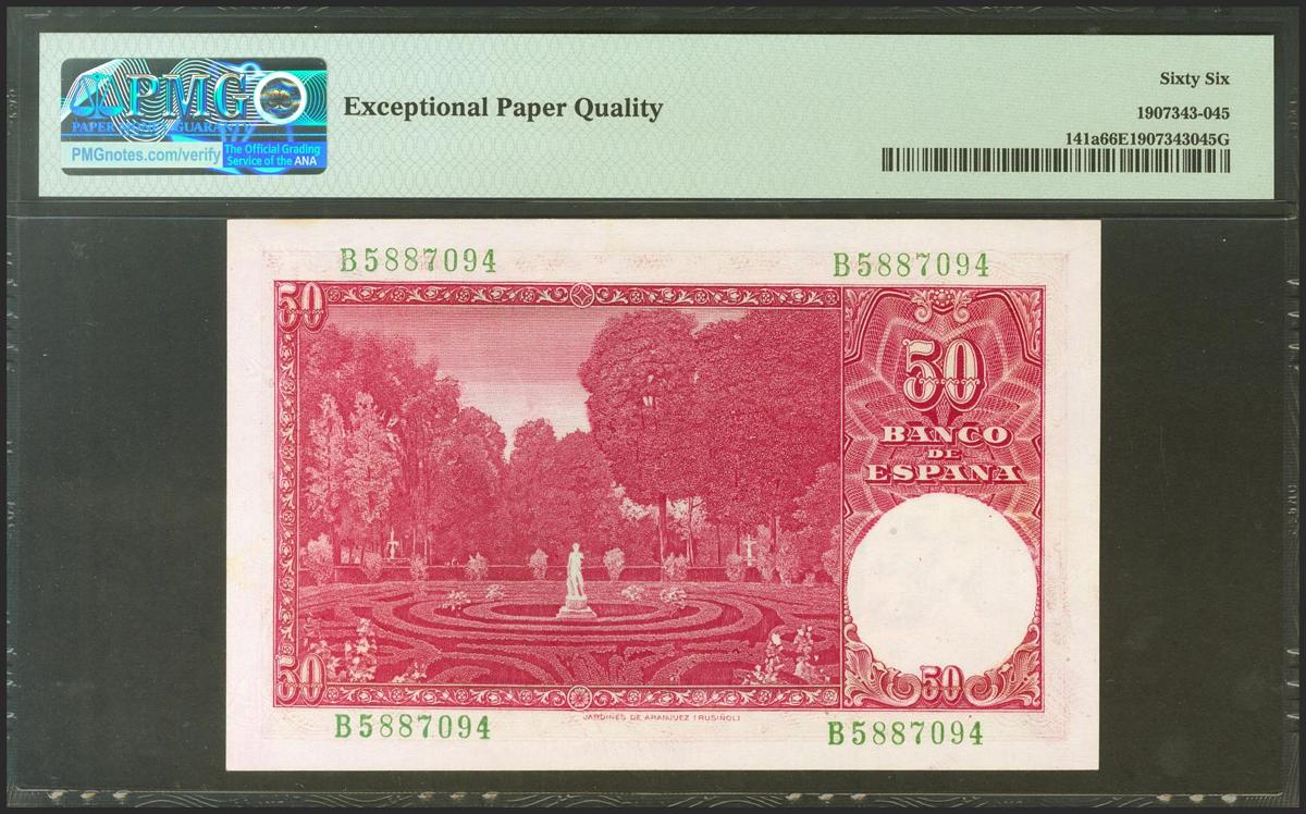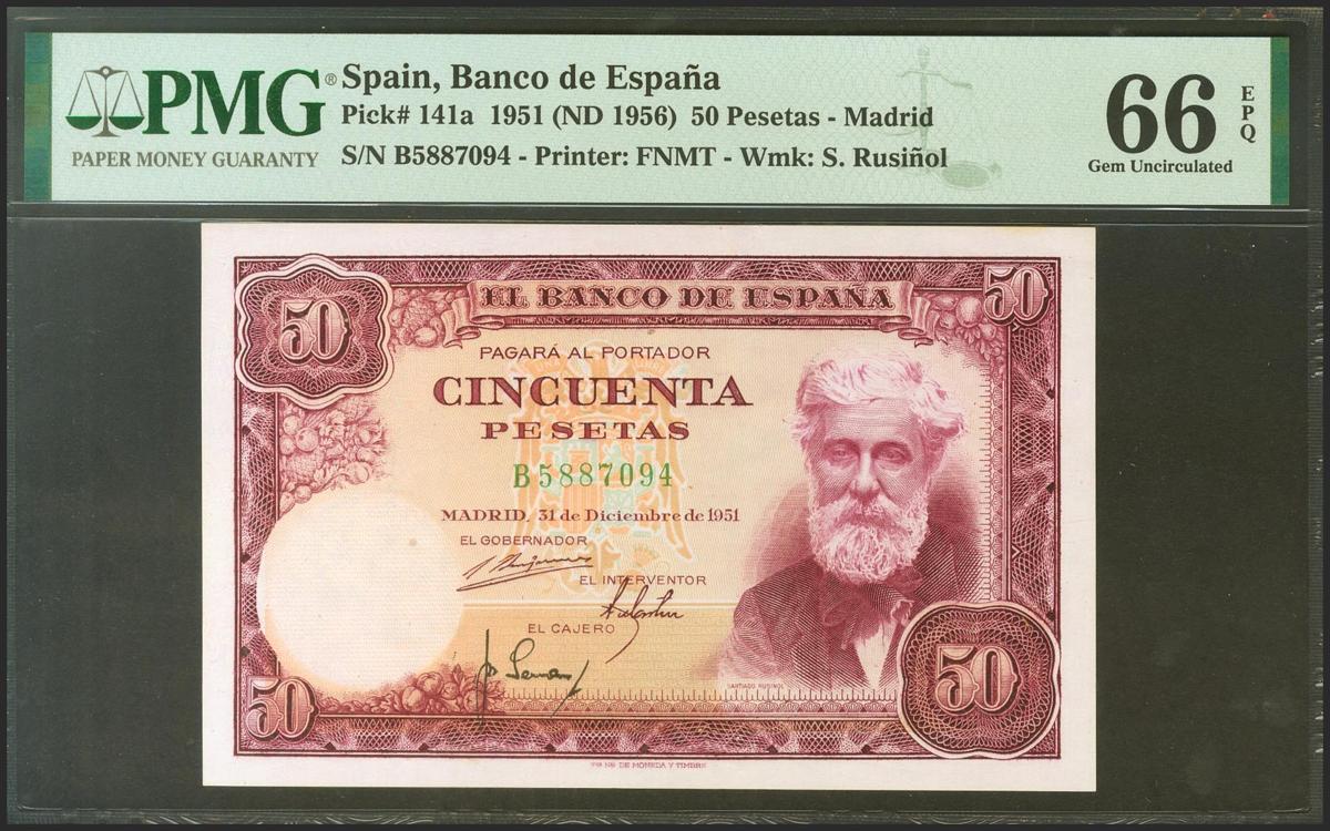 50 Pesetas. 31 de Diciembre de 1951. Serie B. (Edifil 2021: 462a, Pick: 141a). Raro en esta excepcional calidad, apresto original. SC. Encapsulado PMG66EPQ.