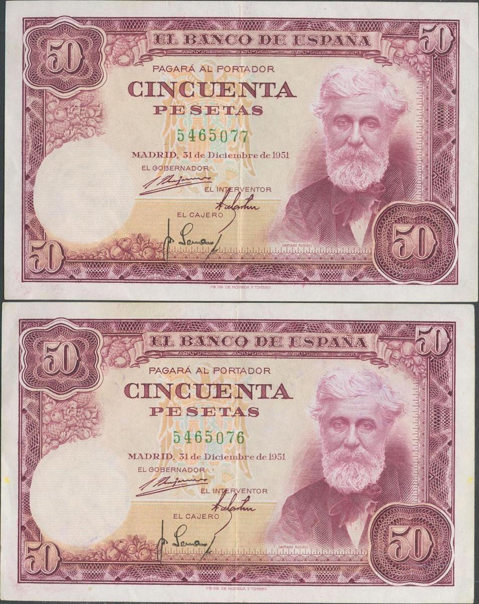 50 Pesetas. 31 de Diciembre de 1951. Pareja correlativa. Sin serie. (Edifil 2021: 462). Conserva gran parte de su apresto original. EBC.