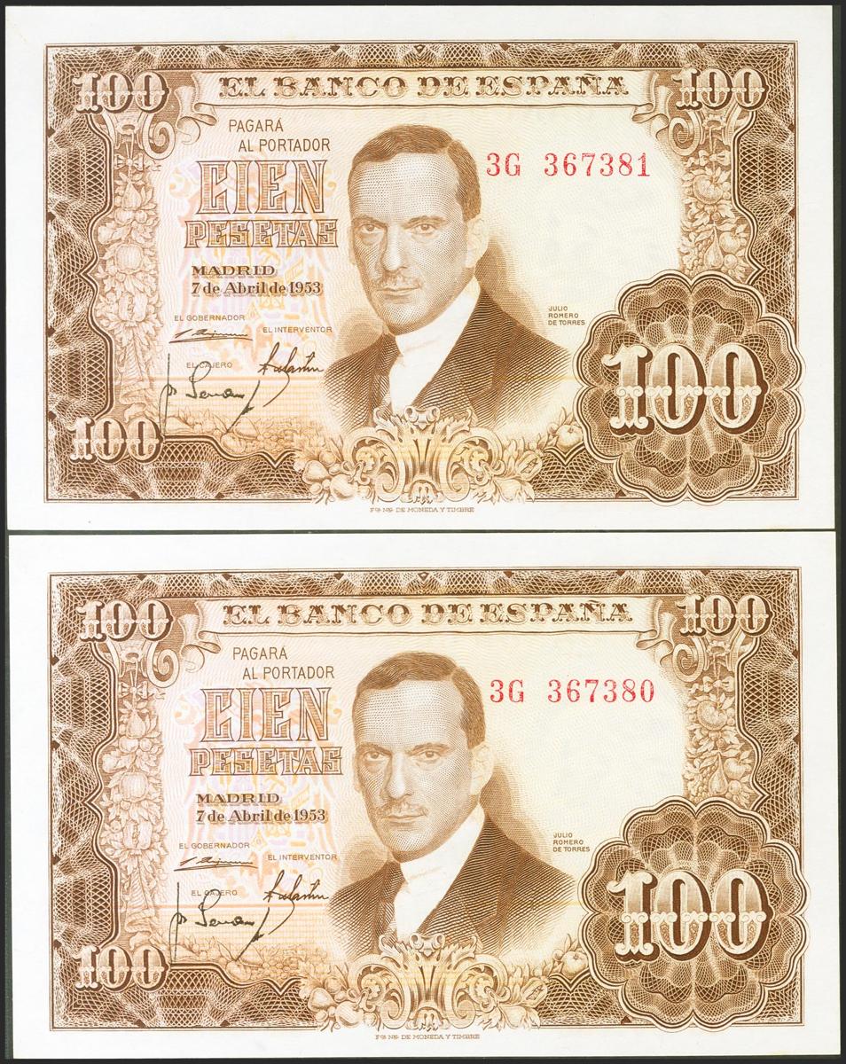 100 Pesetas. 7 de Abril de 1953. Pareja correlativa. Serie 3G. (Edifil 2021: 464c). Apresto original. SC-.