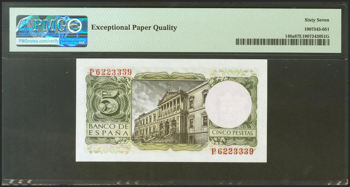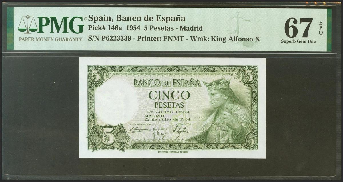 5 Pesetas. 22 de Julio de 1954. Serie P. (Edifil 2021: 466a, Pick: 146a). Inusual en esta excepcional calidad, apresto original. SC. Encapsulado PMG67EPQ.
