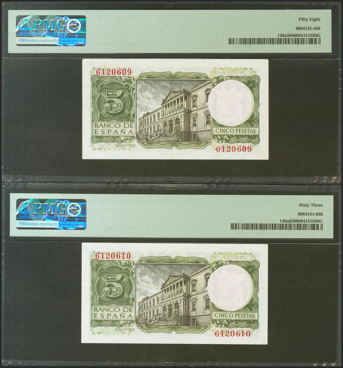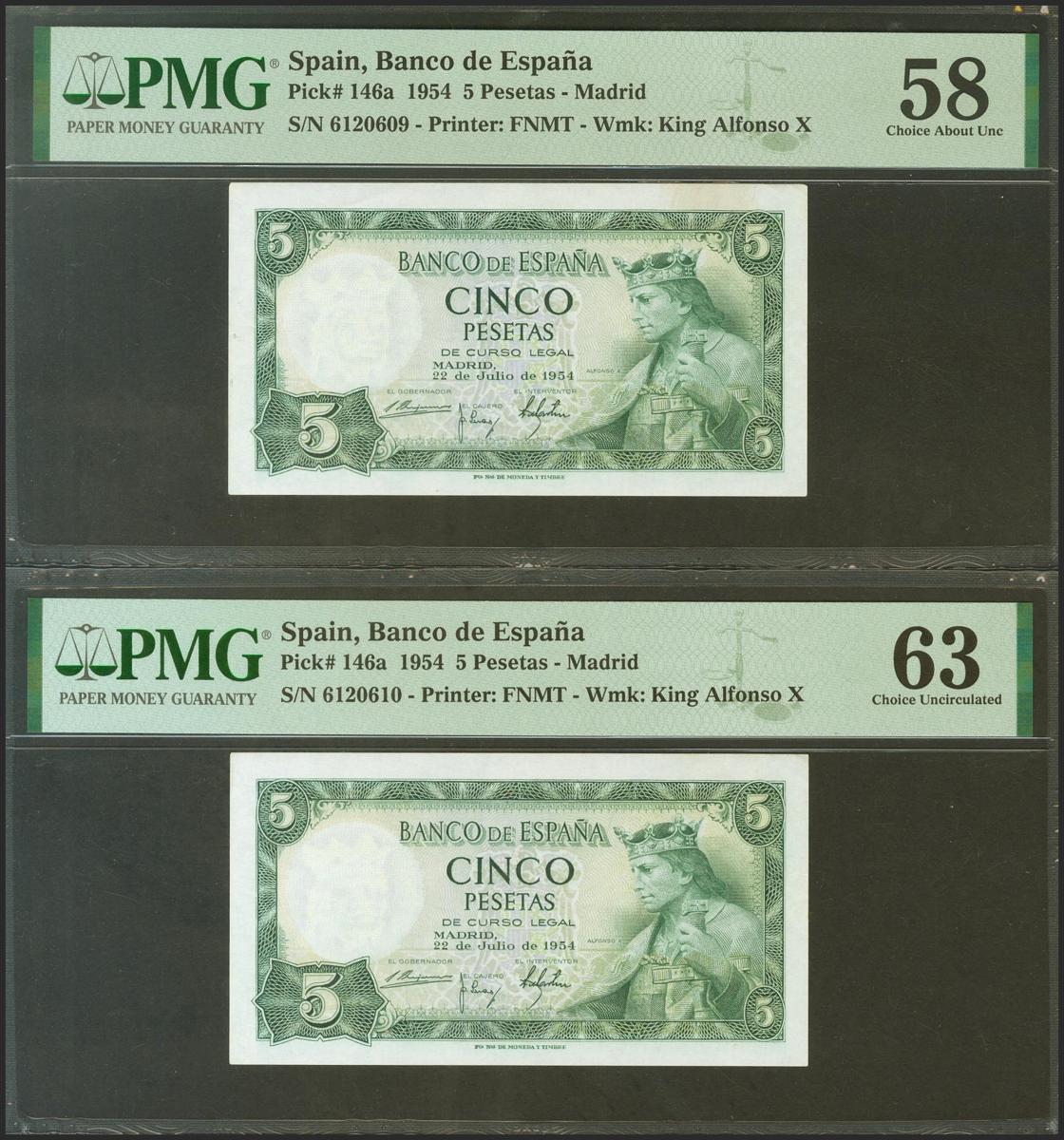 5 Pesetas. 22 de Julio de 1954. Pareja correlativa. Sin serie. (Edifil 2021: 466, Pick: 146a). SC/EBC++. Encapsulados PMG63/58.