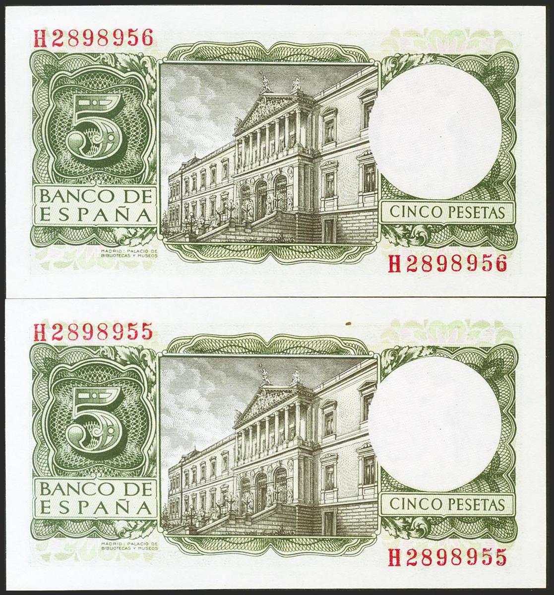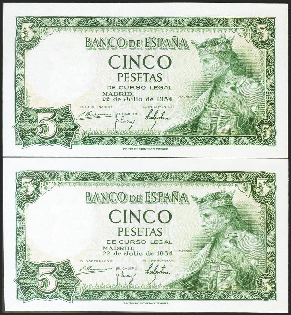 5 Pesetas. 22 de Julio de 1954. Pareja correlativa. Serie H. (Edifil 2021: 466a). Apresto original. SC.
