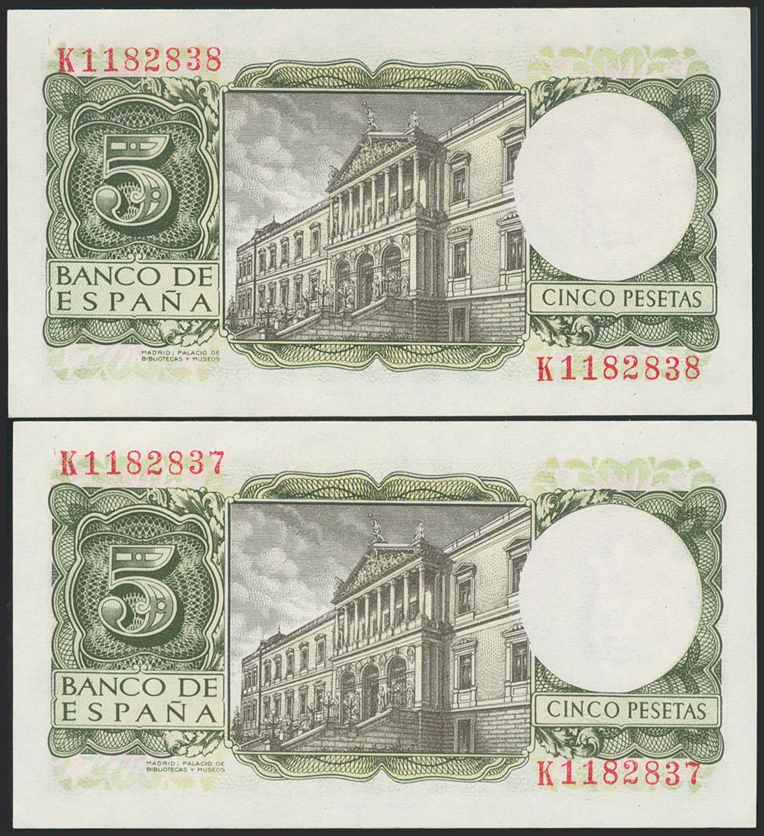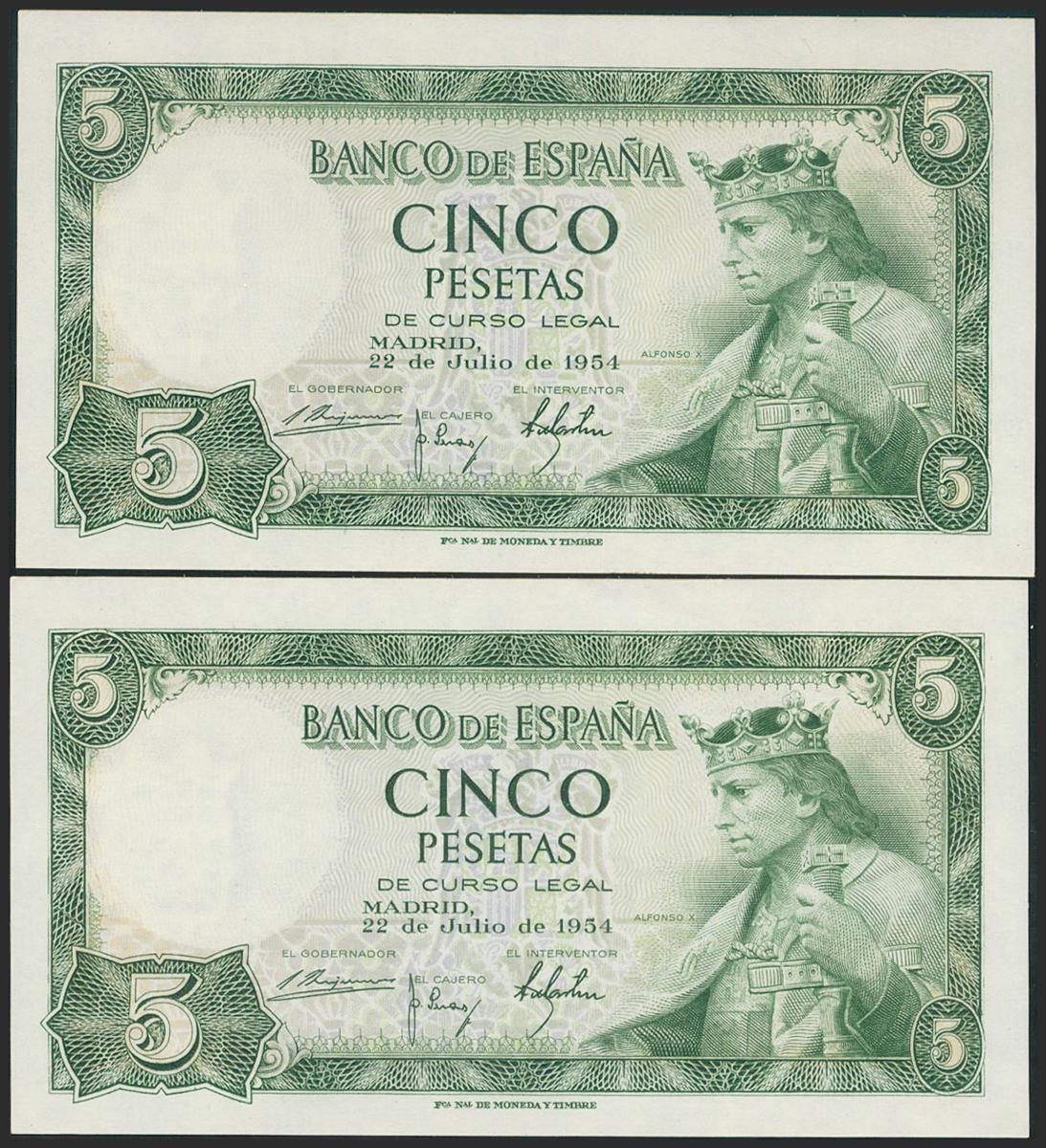 5 Pesetas. 22 de Julio de 1954. Pareja correlativa. Serie K. (Edifil 2021: 466a). Apresto original. SC.