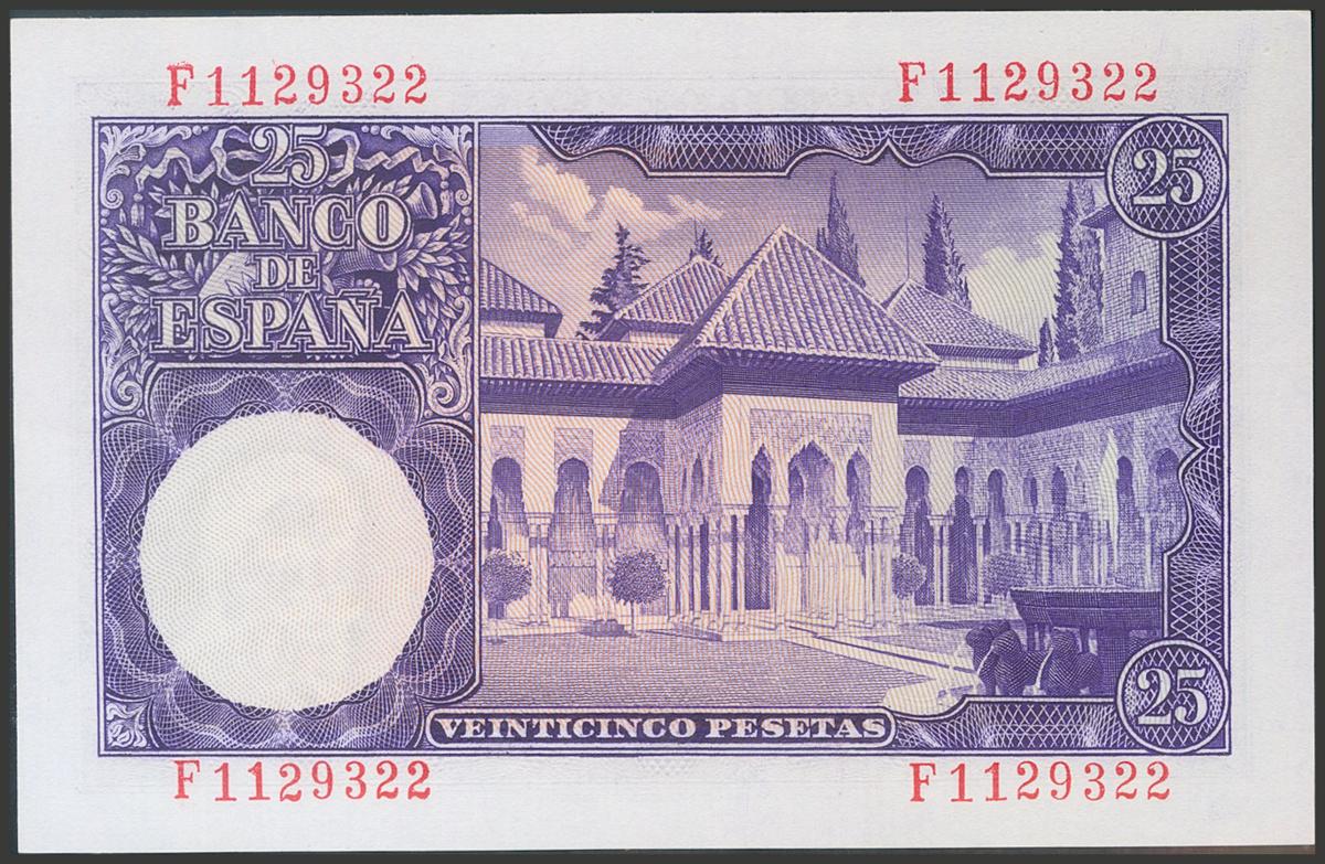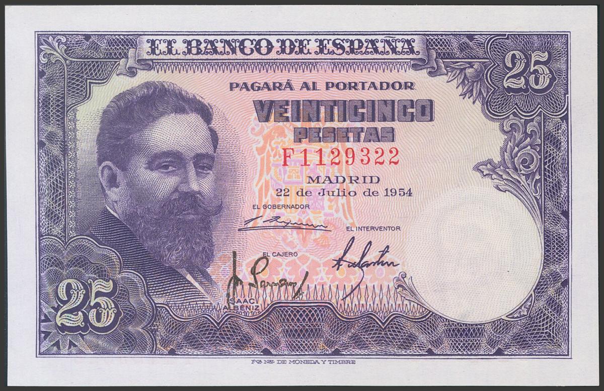 25 Pesetas. 22 de Julio de 1954. Serie F. (Edifil 2017: 467a). Conserva todo su apresto original. SC.