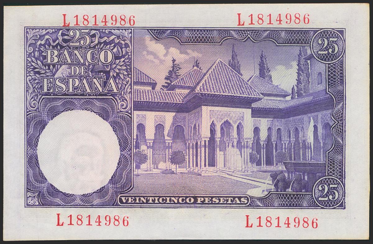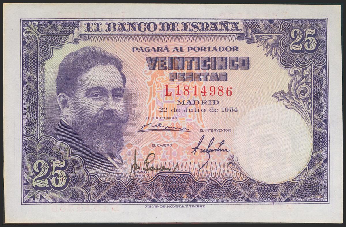 25 Pesetas. 22 de Julio de 1954. Serie L. (Edifil 2021: 467a). Apresto original. SC--.