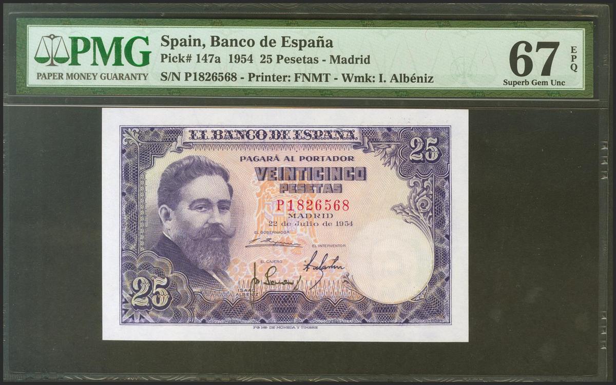 25 Pesetas. 22 de Julio de 1954. Serie P, última serie emitida. (Edifil 2021: 467b, Pick: 147a). Conserva todo su apresto original, serie muy rara. SC. Encapsulado PMG67EPQ.