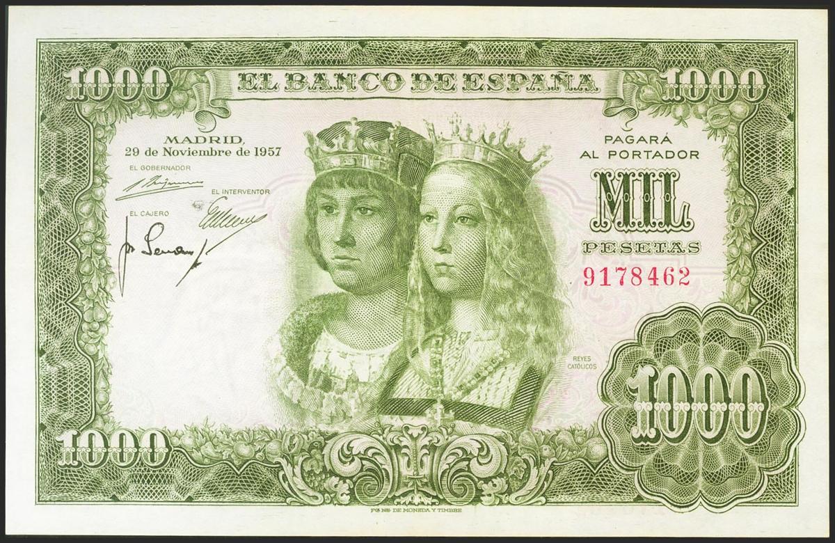 1000 Pesetas. 29 de Noviembre de 1957. Sin serie. (Edifil 2021: 469). Conserva algo de apresto original. EBC.