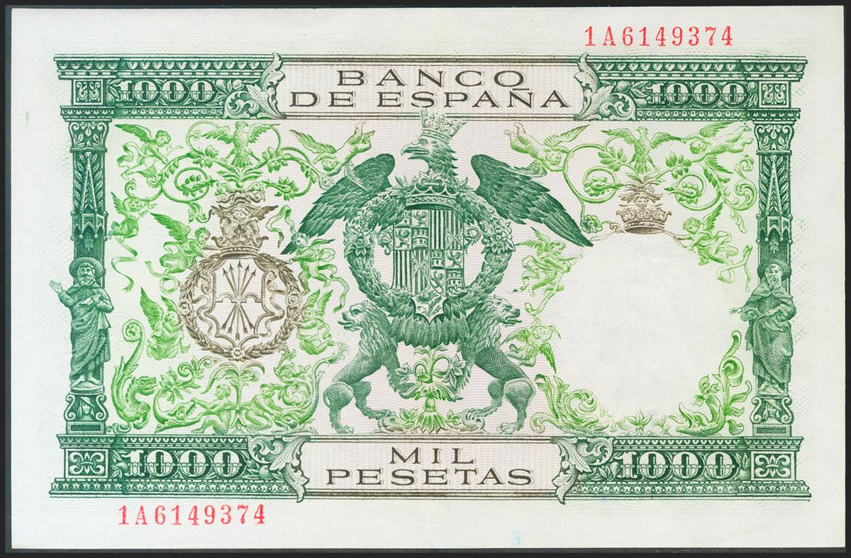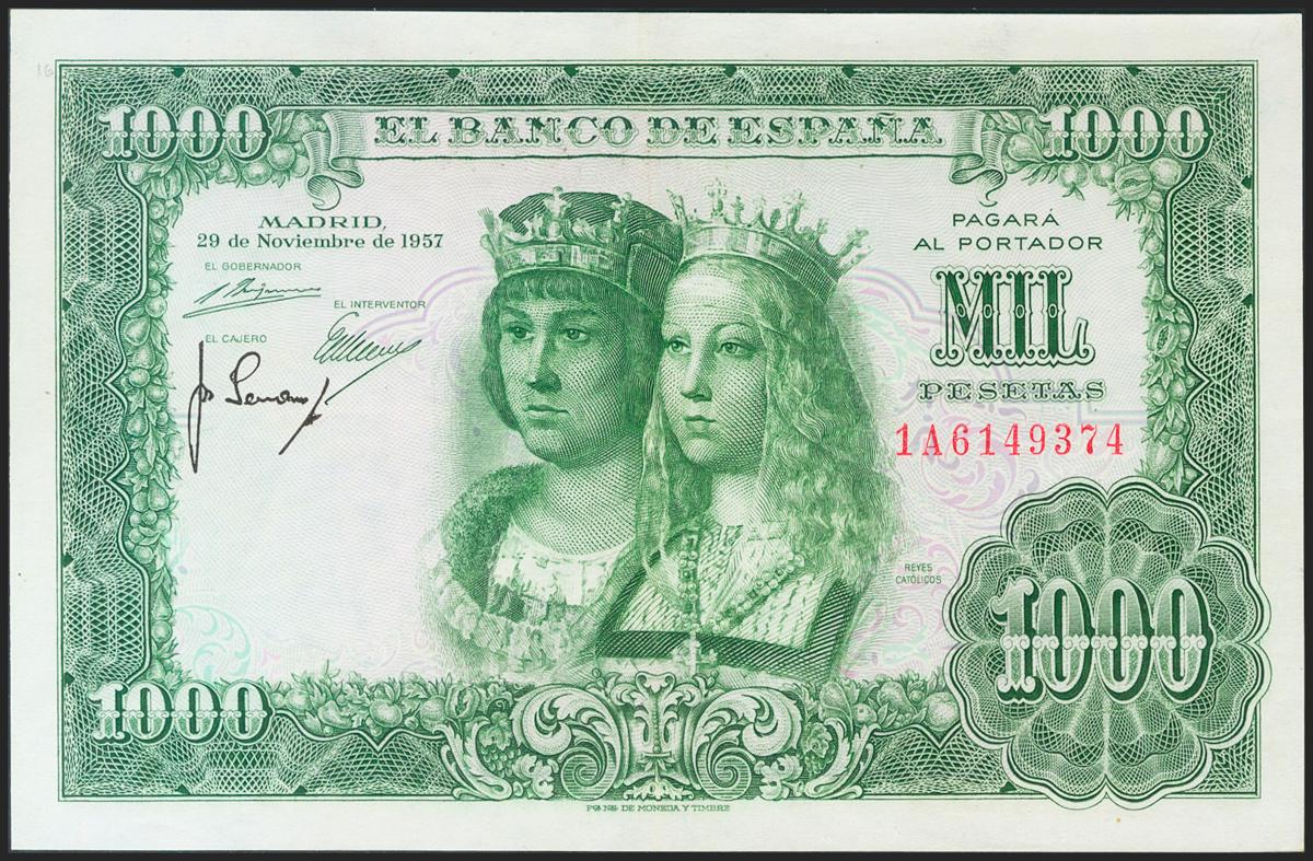 1000 Pesetas. 29 de Noviembre de 1957. Serie 1A. (Edifil 2021: 469b). Conserva gran parte del apresto original. EBC.