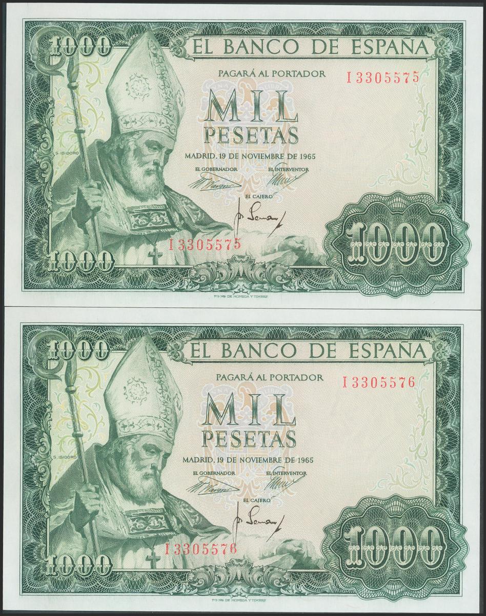 1000 Pesetas. 19 de Noviembre de 1965. Pareja correlativa. Serie I. (Edifil 2017: 471b). Apresto original. SC/SC-.