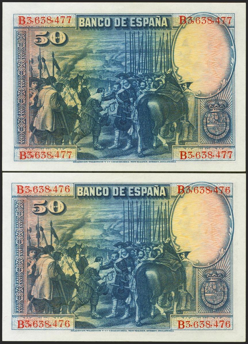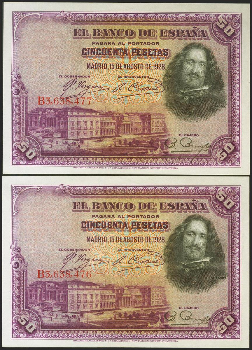 50 Pesetas. 15 de Agosto de 1928. Pareja correlativa. Inusual serie B. (Edifil 2021: 354). Apresto original. SC.
