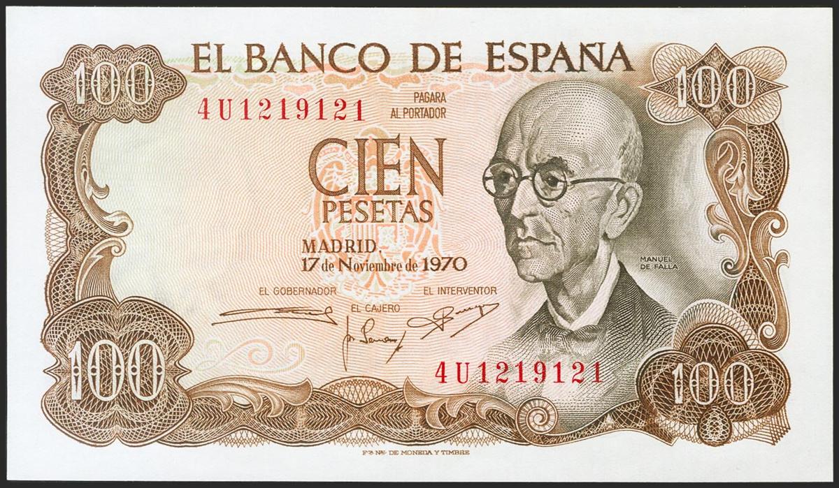 100 Pesetas. 17 de Noviembre de 1970. Serie 4U. (Edifil 2021: 472c). Apresto original. SC.