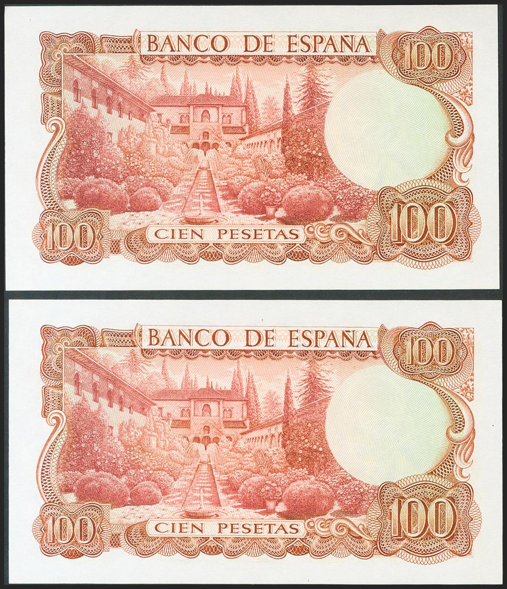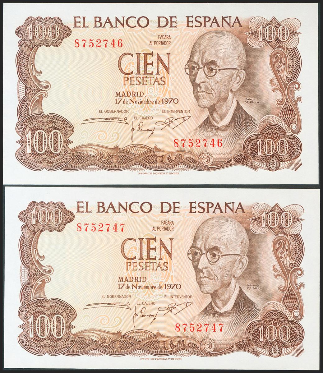 100 Pesetas. 17 de Noviembre de 1970. Pareja correaltiva. Sin serie. (Edifil 2021: 472). Conserva gran parte del apresto original. EBC+.